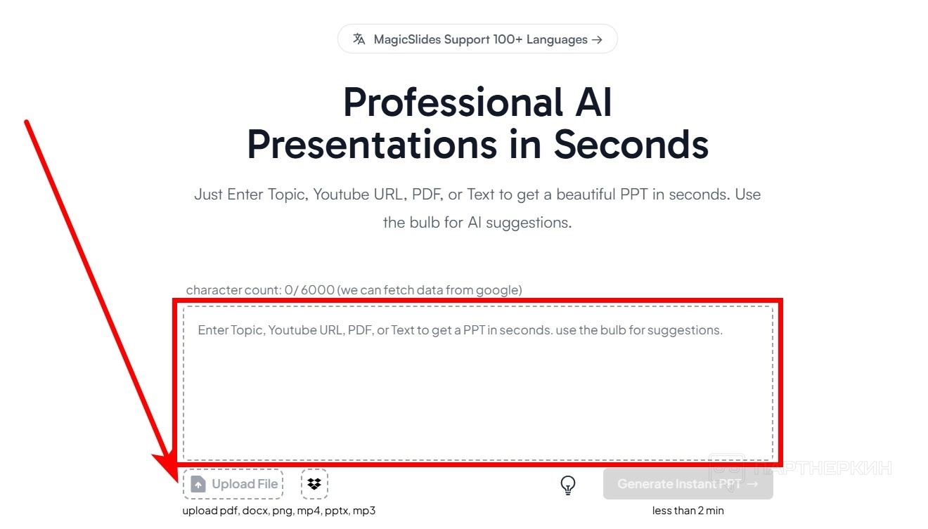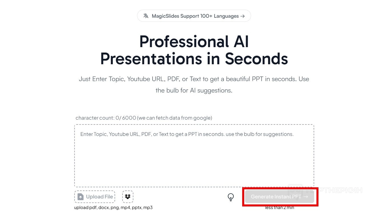 - В основном поле введите текст, URL-адрес, ссылку на Youtube. Или загрузите PDF-файл.