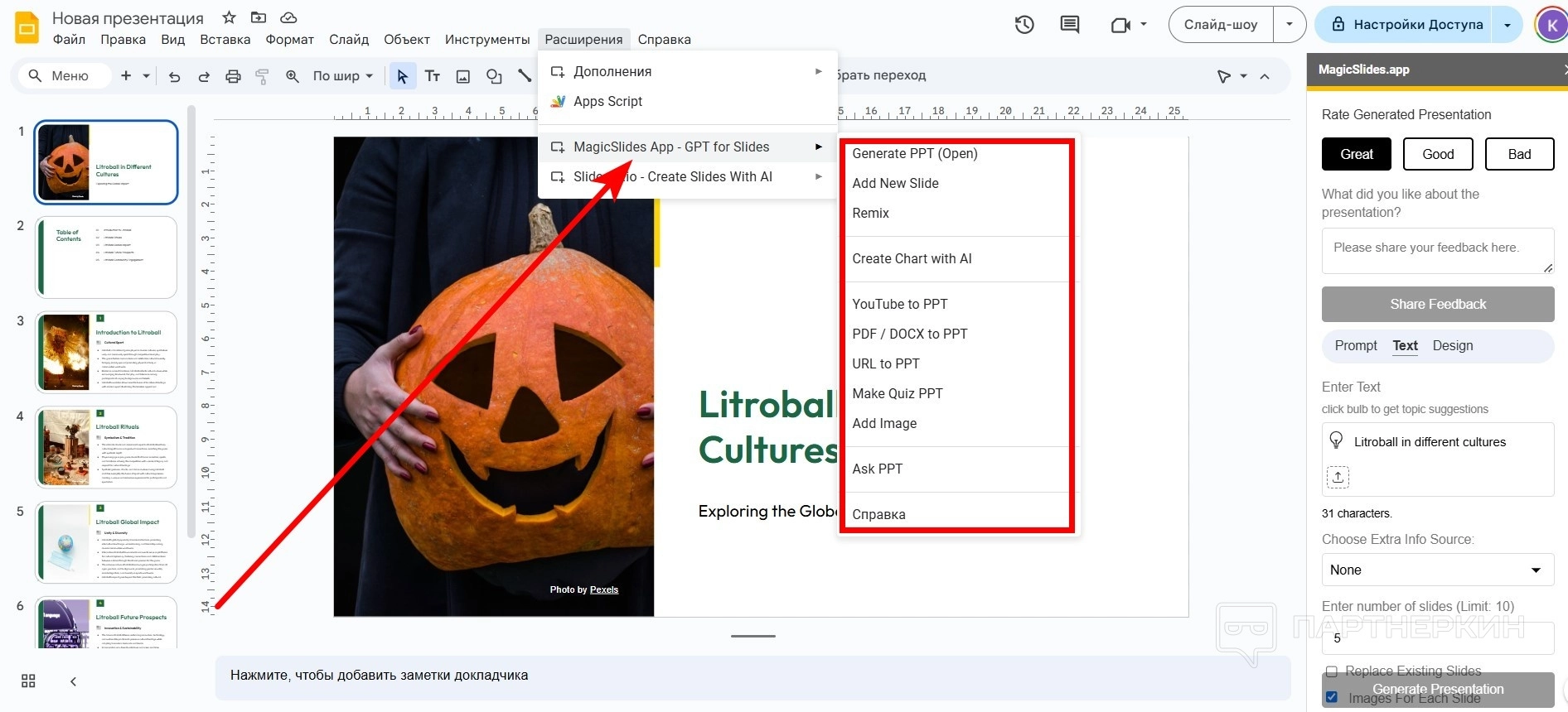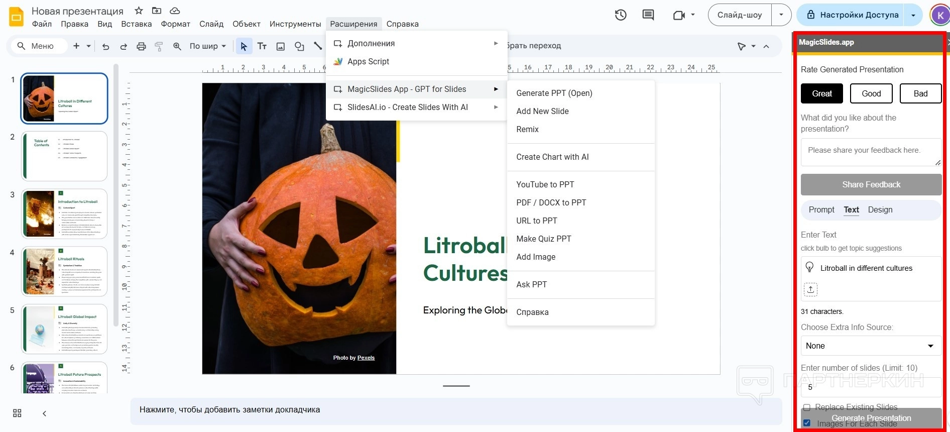 Инструменты расширения будут располагаться в боковой части экрана. Однако генерация презентаций тесно связана с аккаунтом MagicSlides. То есть, если заканчивается подписка в веб-версии, создавать слайды становится невозможным и в расширении.