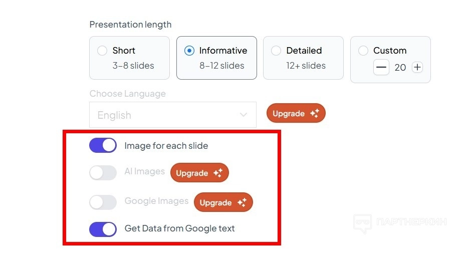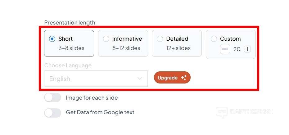 - Настройте будущую презентацию. Выберите количество слайдов и язык.