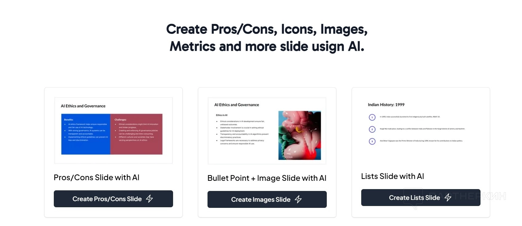 Ряд инструментов для создания отдельных слайдов. Опции на основе ИИ позволяют улучшить презентации и визуализировать данные с минимальными усилиями.