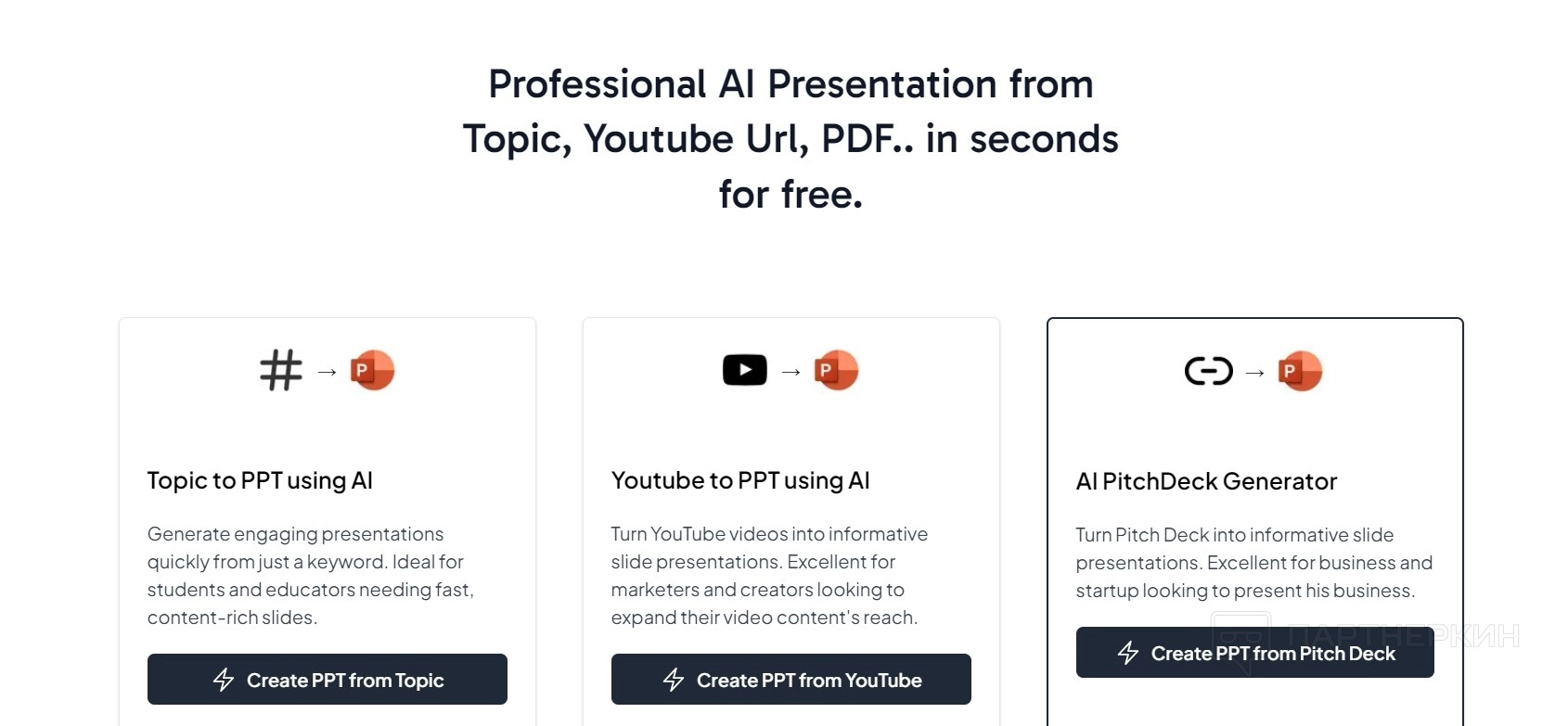 - генератор Pitch Deck (AI PitchDeck Generator) — превращение презентаций в информативные слайды;