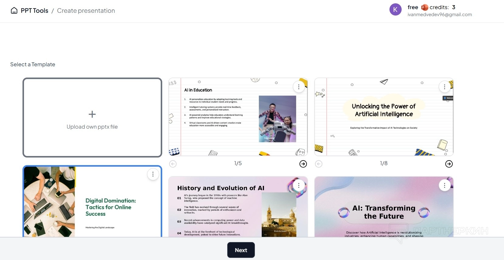 Идеально подходит для начинающих пользователей, которые не планируют создавать большое количество презентаций. С этим планом можно создать до 3 презентаций в месяц, что достаточно для базовых потребностей. Включает основные функции, такие как конвертация данных с Wikipedia и возможность использовать до 10 слайдов в одной презентации. Однако использование других функций, таких как видео конвертация или изображения с Google, недоступно. Этот план предоставляет 3 кредита на старте. Каждый месяц пользователь получает 3 новых кредита.