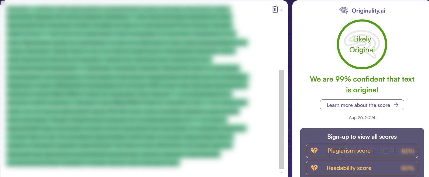 Originality.aiспособен точно выявлять оригинальность контента, включая тексты, которые были переработаны или отредактированы. Это особенно полезно для компаний, работающих с фрилансерами и аутсорсингом.