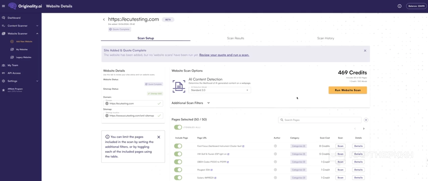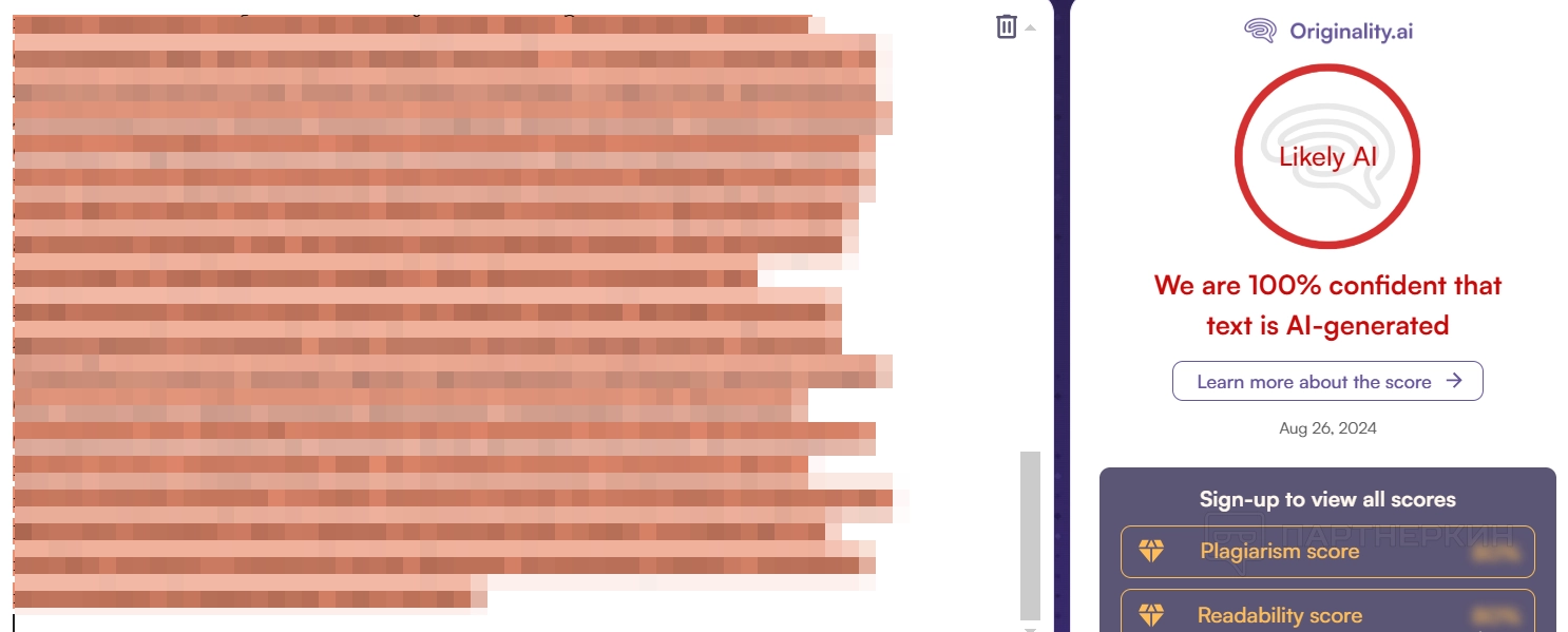 Сканирование сайта помогает также избежать штрафов поисковых систем и создает условия для более прозрачного управления контентом, создавая отчет по всем выявленным материалам, созданным с использованием искусственного интеллекта. Это удобный способ провести аудит всего сайта, не тратя много времени на ручную проверку.
