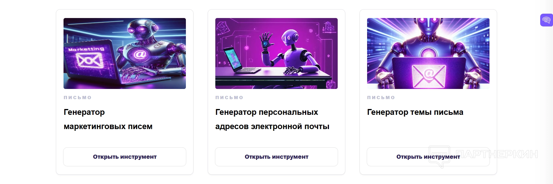 - Генератор маркетинговых писем — помогает с созданием привлекательных и убедительных писем для рекламы и взаимодействия с клиентами.