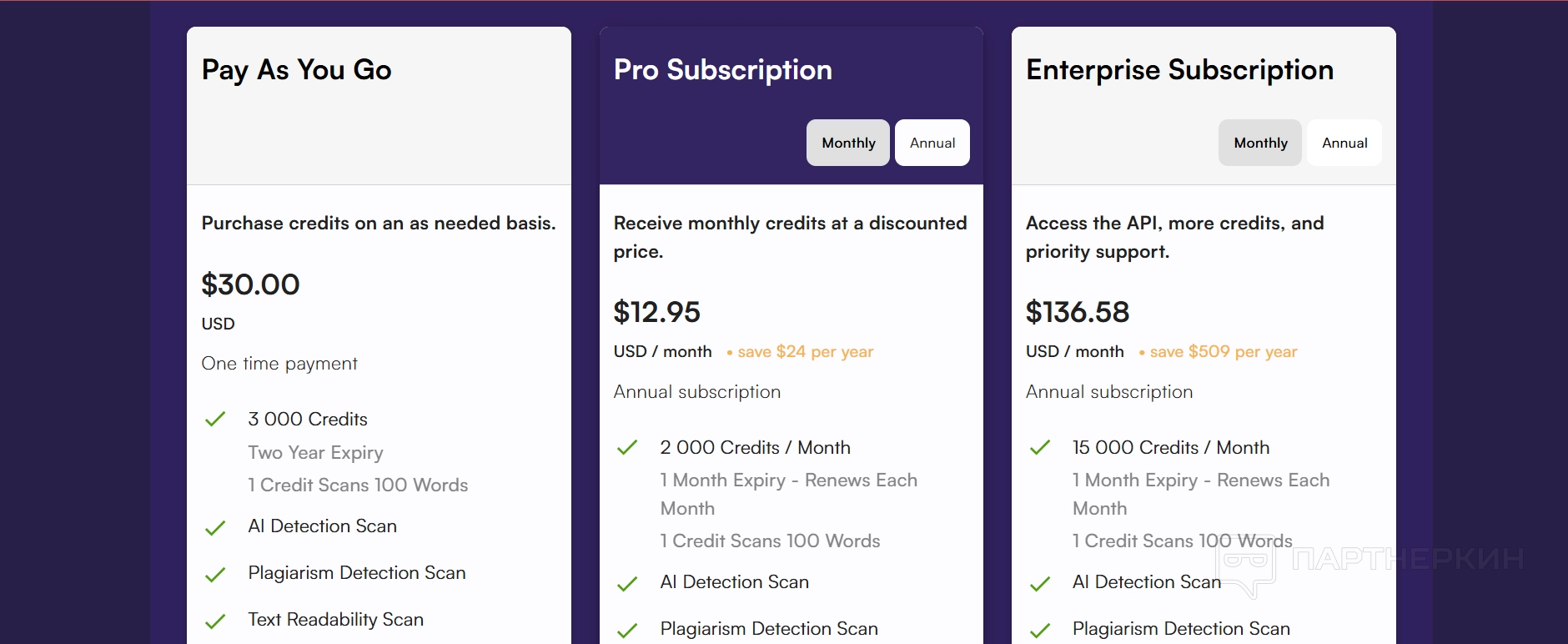 Enterprise Subscription — тариф для корпоративных пользователей стоимостью $136.58 в месяц с возможностью экономии $509 при годовой оплате. Предоставляет 15 000 кредитов каждый месяц, которые обновляются ежемесячно (1 кредит = 100 слов). Включает все функции Pro Subscription и расширенные возможности: доступ к API для интеграции с другими системами, приоритетную техническую поддержку и доступ к истории сканов на протяжении 365 дней.