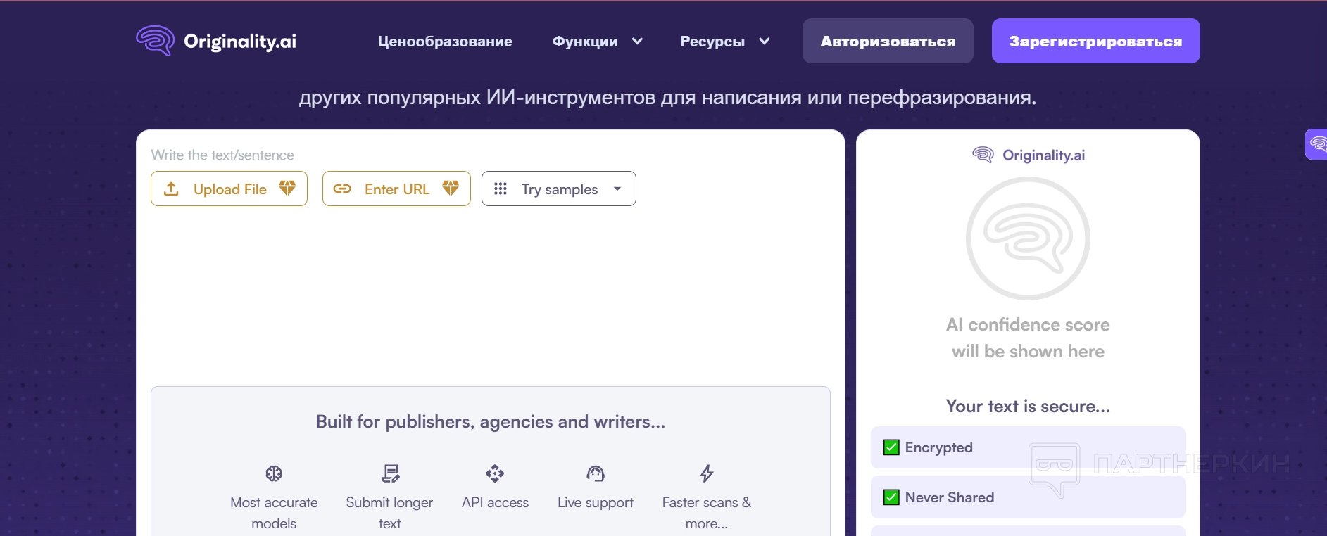Опцию можно проверить бесплатно — вставить текст, урл сайта или файл, и ИИ проверит его. Объем ограничен 2000 слов.