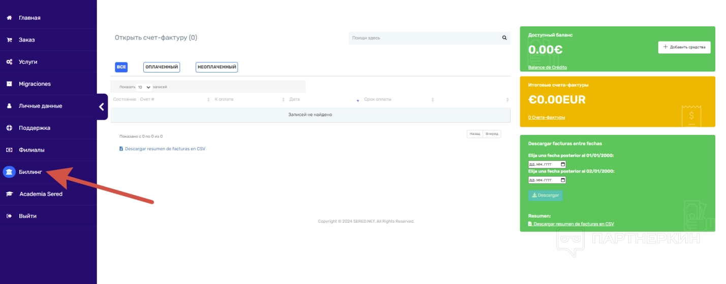 Ниже вы найдете раздел «Биллинг». В нем будут храниться все ваши счета и информация по совершенным платежам.
