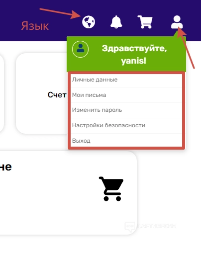 Для переключения языка интерфейса можно воспользоваться первой кнопкой в строке уведомлений. Рядом с ней отображен значок с оповещениями. Там же вы найдет корзину и раздел с настройками учетной записи. Некоторые разделы из настроек продублированы в панели управления.