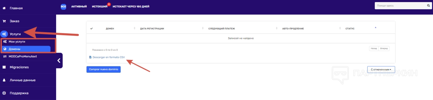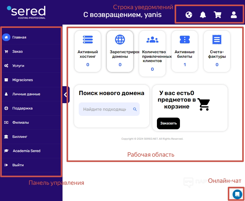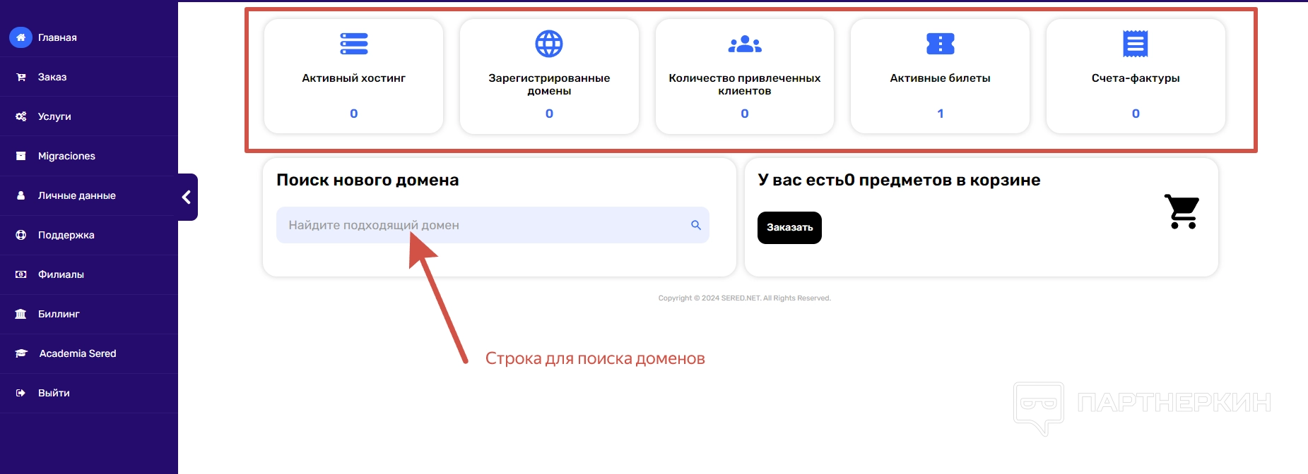 Это раздел со сводной информацией. Отсюда вы можете перейти в корзину или найти интересующий домен. Также на главной отображается количество оформленных услуг, а именно: