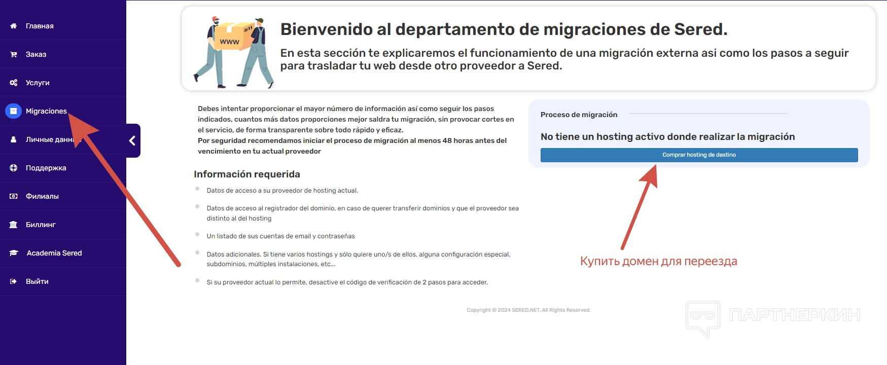 - Бесплатная служба веб-миграции . Если у вас уже есть сайт на другом хостинге, команда Sered бесплатно поможет перенести его на свои серверы. Это удобно для тех, кто не хочет вникать в технические тонкости и беспокоиться о сохранении данных. Процесс проходит быстро и без простоев для сайта.