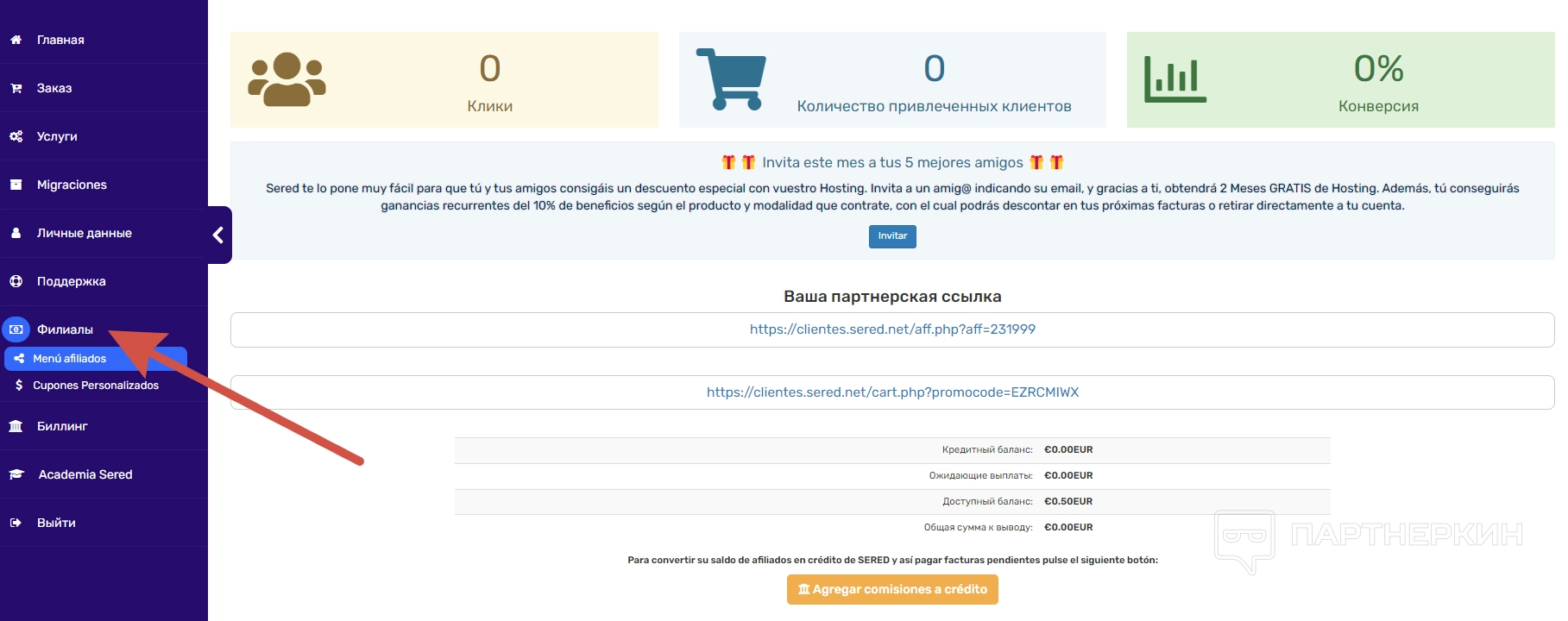 Далее идет раздел «Филиалы» - это реферальная программа. Здесь вы найдете 2 ссылки. В первой находится партнерская ссылка и прочие рекламные материалы. В ней же будут отображаться клики, количество приглашенных пользователей, конверсия. Во второй вкладке вы можете ознакомиться с условиями партнерской программы.