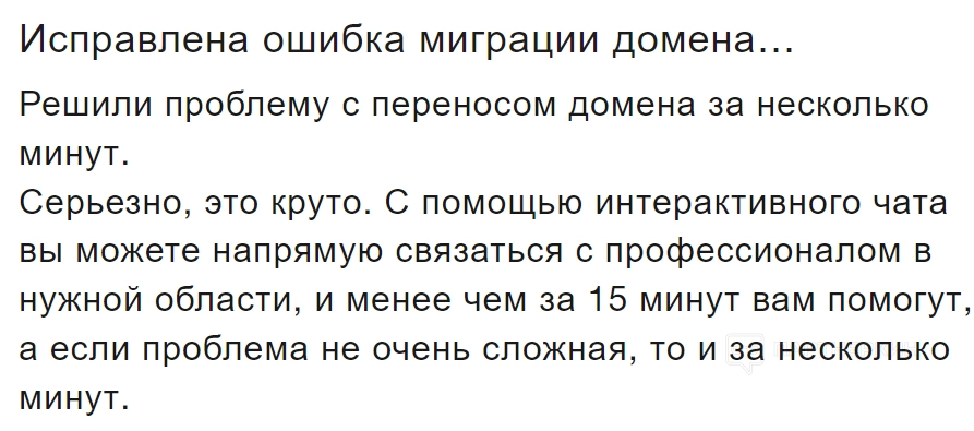 Отдельно отмечается, что специалисты оперативно помогают с переносом доменов. Радует наличие интерактивного чата, с помощью которого можно напрямую связываться с представителями сервиса.