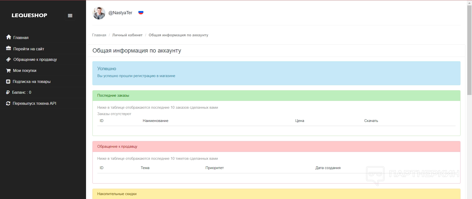 После регистрации пользователь попадает в личный кабинет, где он может просмотреть все свои покупки на сервисе, а также пополнить внутренний баланс для оплаты заказов. Здесь же находится информация о реферальной программе и инструкция для интеграции внутреннего счета с сервисом по API для быстрой оплаты.