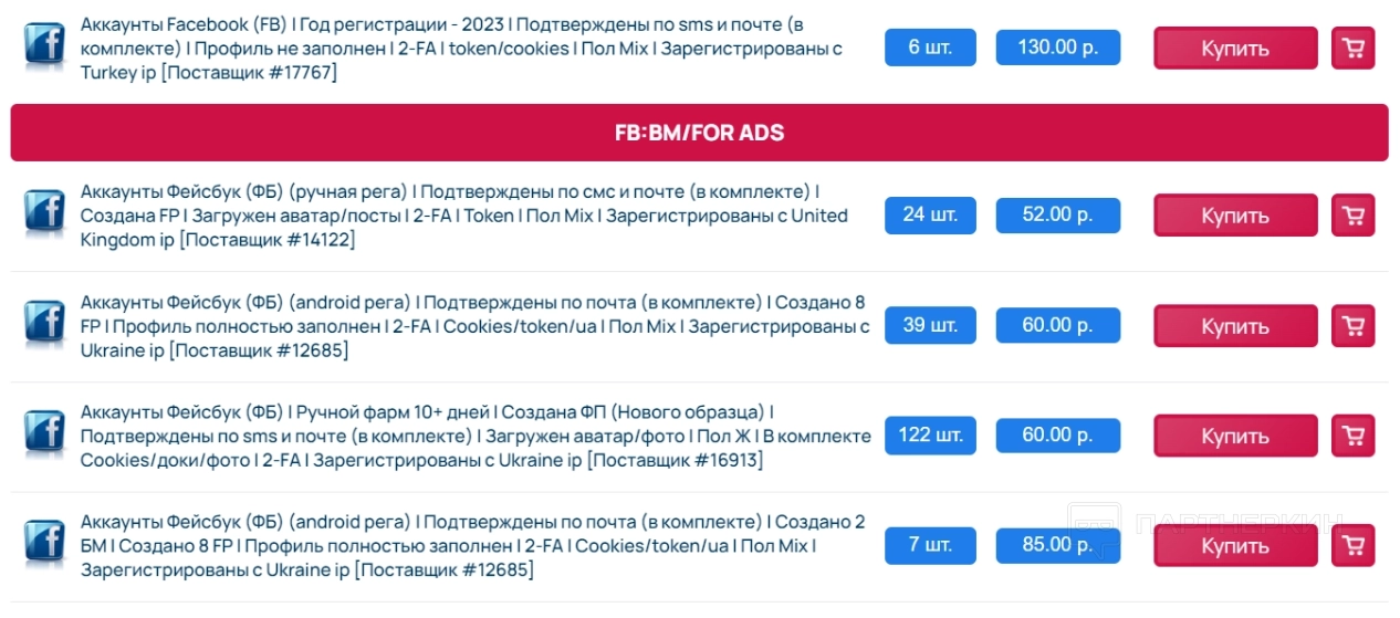 • большой выбор аккаунтов для разных социальных сетей и мессенджеров — можно приобрести аккаунты для Фейсбука*, Инстаграм*, Тик Тока, Твиттера и так далее. Помимо этого, здесь продаются и почты;