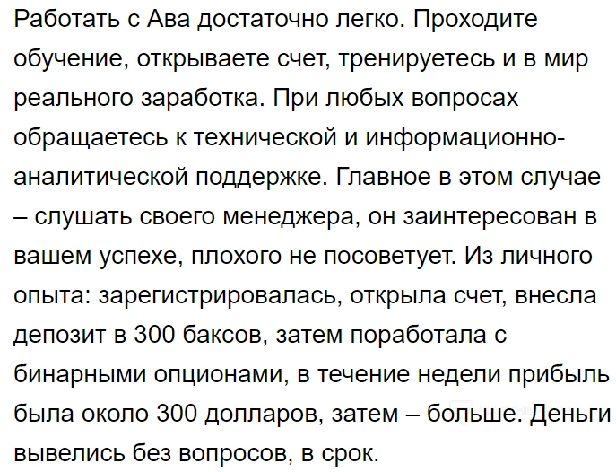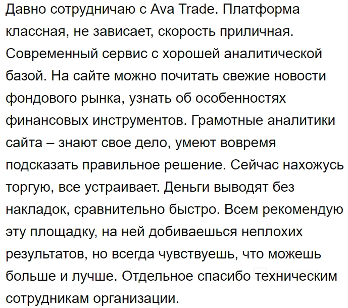 Как пишет еще один трейдер, все должны понимать, что игра на фондовой бирже – это рискованный бизнес, но представители AvaTrade полностью справляются с техническим обслуживанием и информационной поддержкой.