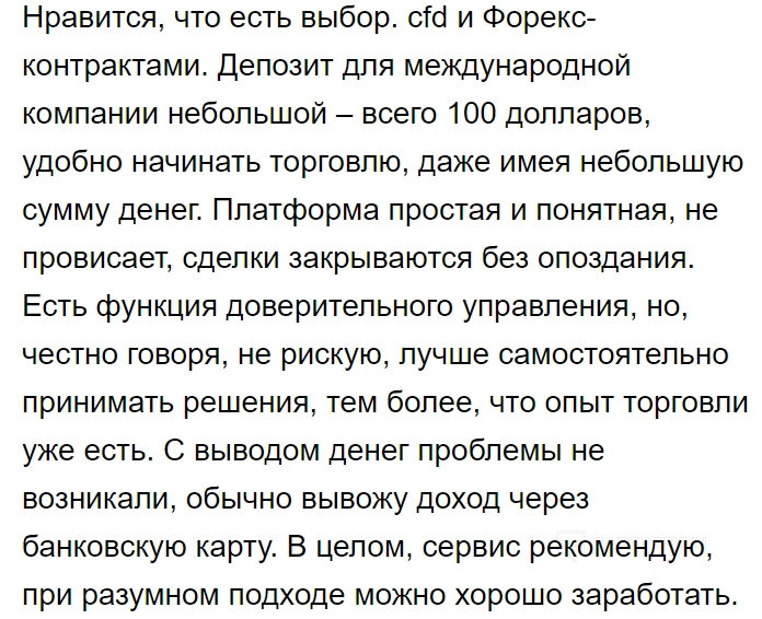 Отдельно специалисты по торгам довольны, что есть функция доверительного управления, сделки закрываются без опоздания и есть возможность выводить деньги на банковские карты.