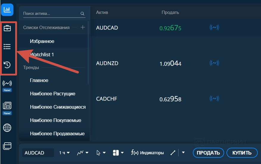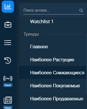 Ниже идет вкладка «Тренды», с помощью которой вы можете отбирать активы по следующим параметрам:
