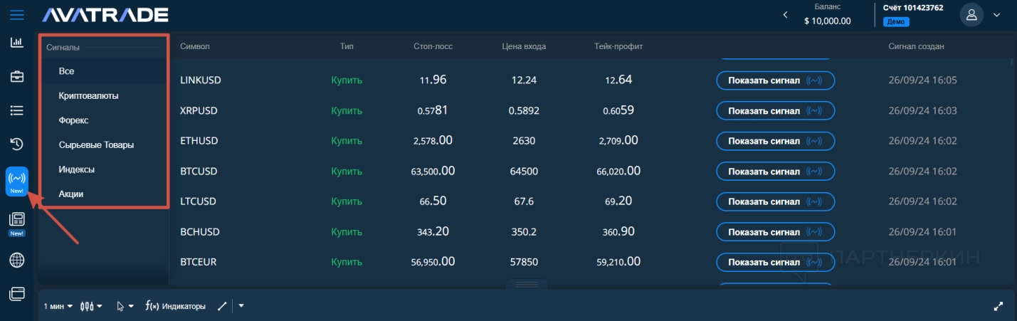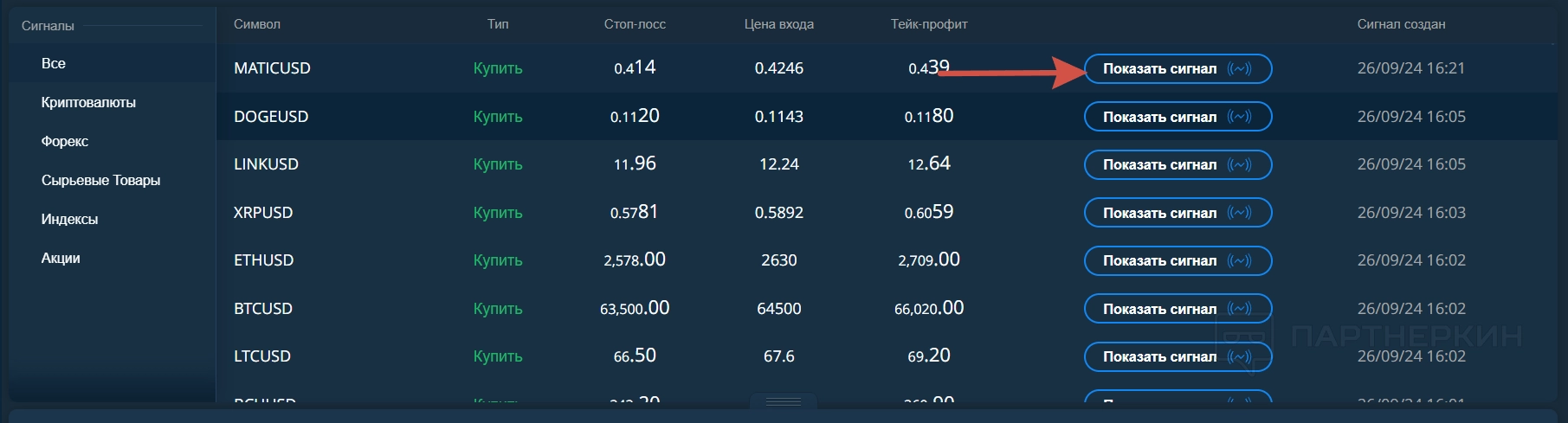 Это новый раздел, в котором отображаются сигналы по всем типам цифровых активов. В левой части экрана вы найдете табличку, где вы сможете отбирать нужные вам позиции.