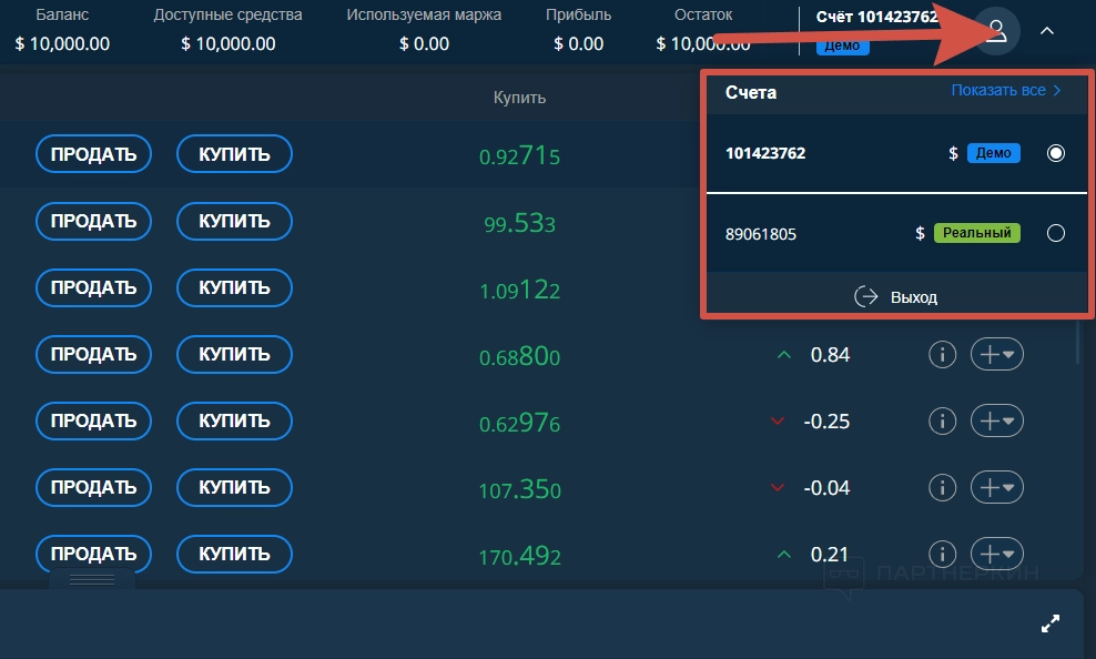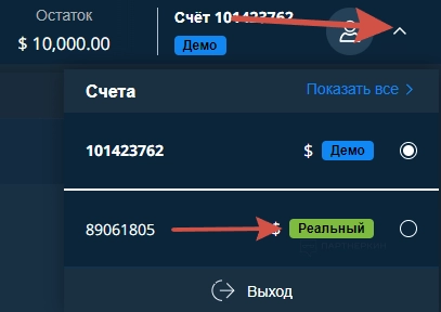 Функционал демо-счет ничем не отличается от реального. Единственное – в панели управления нет раздела для пополнения баланса. Но это и не нужно в демонстрационном режиме, так как баланс демо имеет $10 000. Если же нужно переключиться на реальный счет, снова жмем на значок в правом верхнем углу и просто жмем на название.