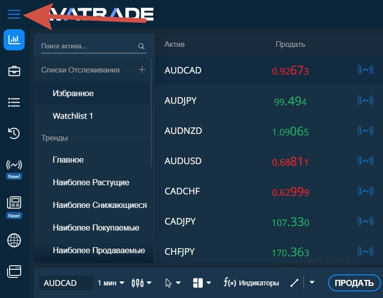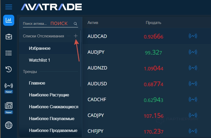 - Выбор актива . После пополнения счета трейдер выбирает актив, который хочет купить или продать. В AvaTrade можно торговать акциями, валютами, индексами и даже товарами, такими как нефть или золото.