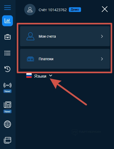 Откроется меню, где вы увидите 2 раздела: мои счета и платежи. Также там будет переключатель языков интерфейса.
