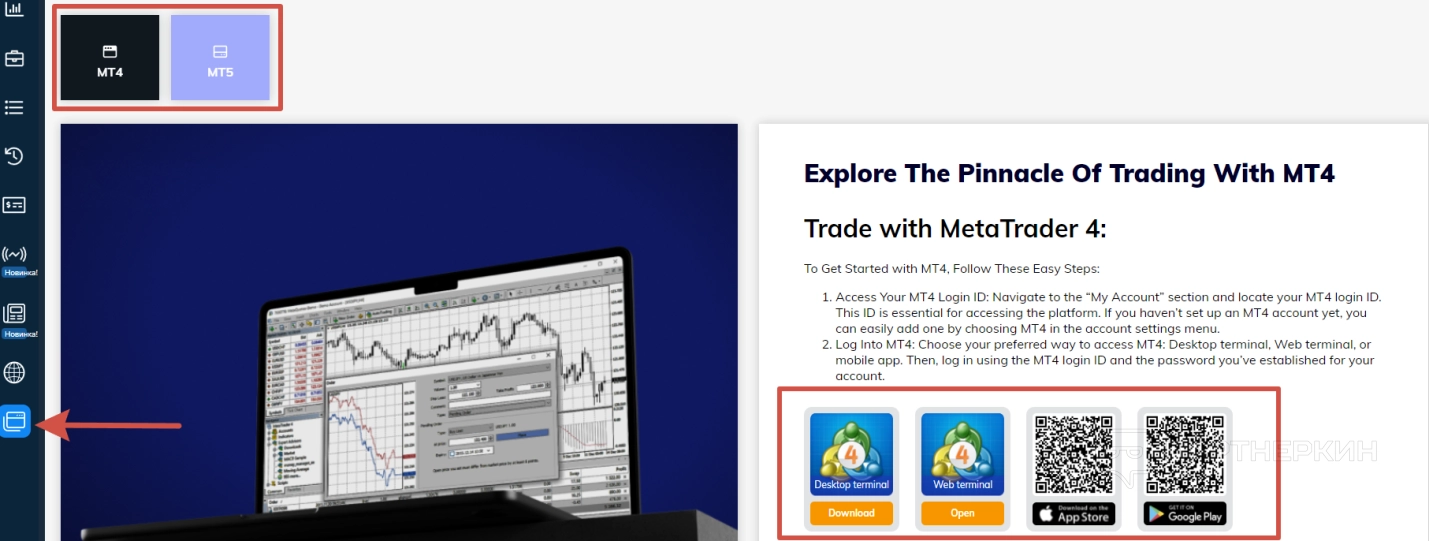 - MetaTrader 4 и 5 . Платформа поддерживает работу с популярными торговыми терминалами MetaTrader 4 и MetaTrader 5. Эти программы позволяют расширить возможности анализа, автоматической торговли и настройки графиков.