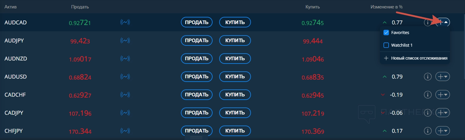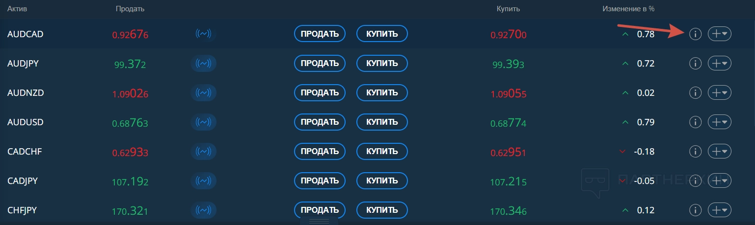Когда вы выберите подходящий тип активов, они отобразятся в сводной таблице. Здесь вы сможете ознакомиться со стоимость, последними изменения в процентном соотношении, а также купить или продать актив.