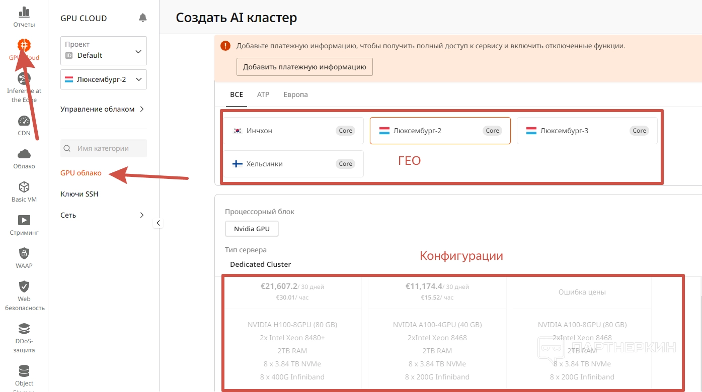 - GPU облако — в этой вкладке вы сможет создавать и настраивать ИИ-кластера по выбранным регионам. Указав определенное ГЕО, перед вами раскроется список доступных конфигураций. Но для начала нужно будет пополнить счет.