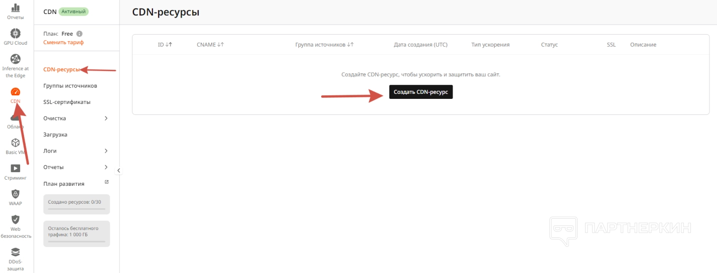 Для этого нужно во вкладке «CDN-ресурсы» нажать на кнопку «Создать CDN-ресурс», подключить к сервису свой сайт и следовать дальнейшим инструкциям.
