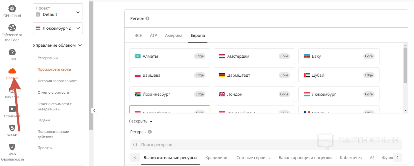 - Управление облаком — здесь вы можете выбрать регион: Алматы, Амстердам, Баку, Варшава, Дармштадт, Йоханнесбург, Лондон, Люксембург 1,2,3, Париж, Стамбул, Ташкент, Франция, Хельсинки. В нем же можно откорректировать такие параметры, как вычислительные ресурсы, хранилище, сетевые сервисы, балансировщики нагрузки, ИИ, реестр контейнеров, логирование и базы данных.