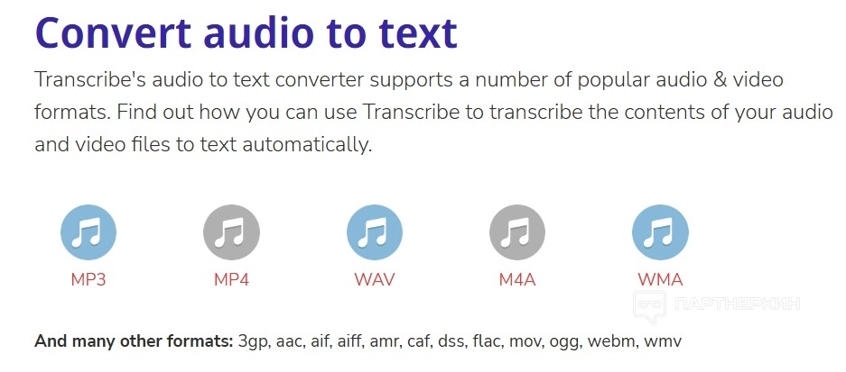- Экспорт расшифровок в файлы doc, txt или субтитры (SRT, WebVTT).