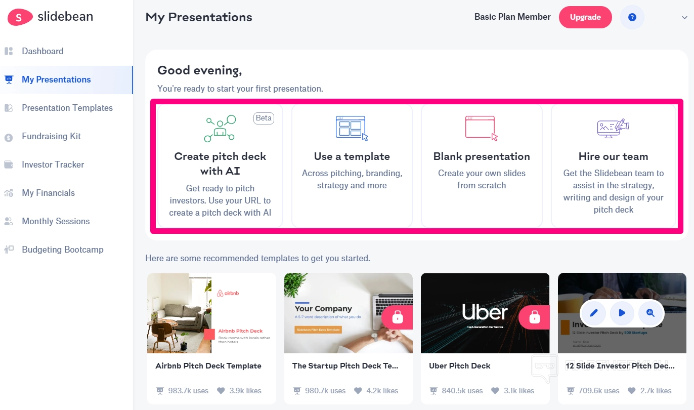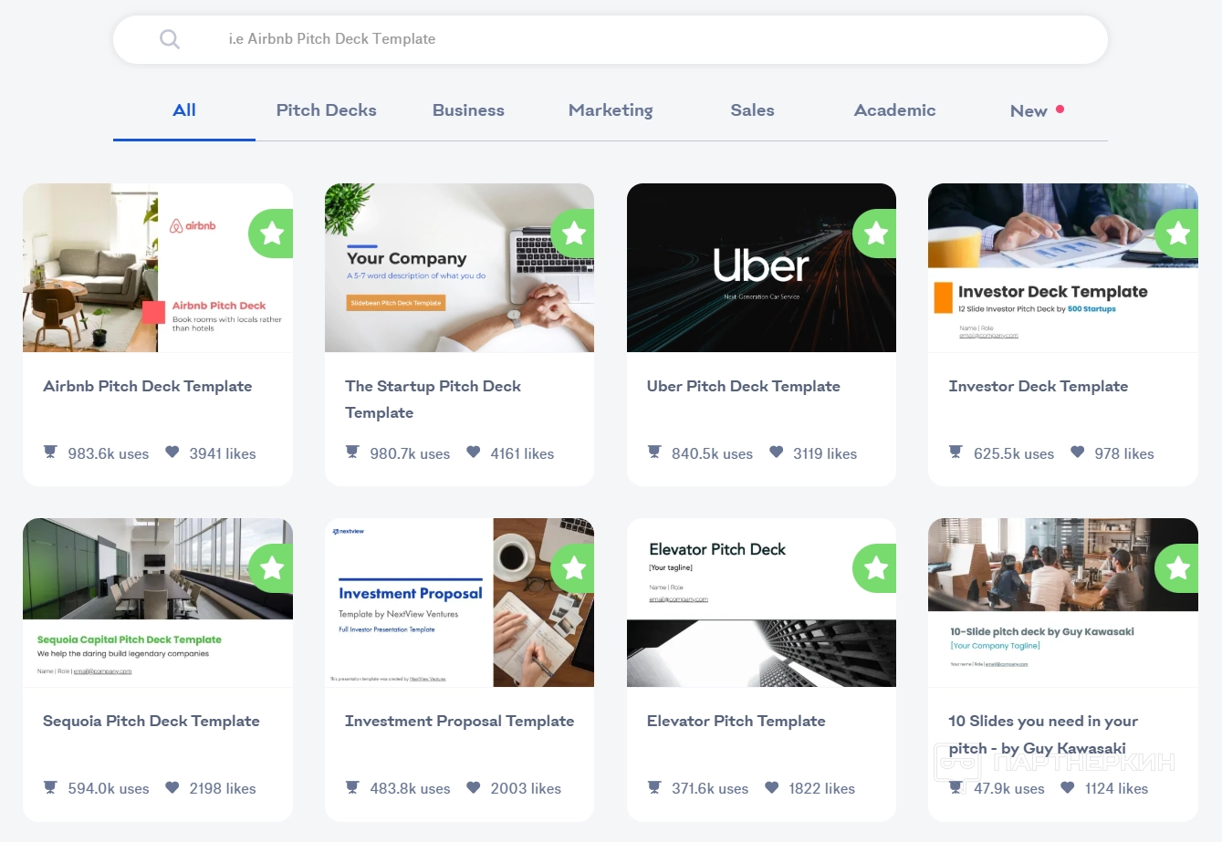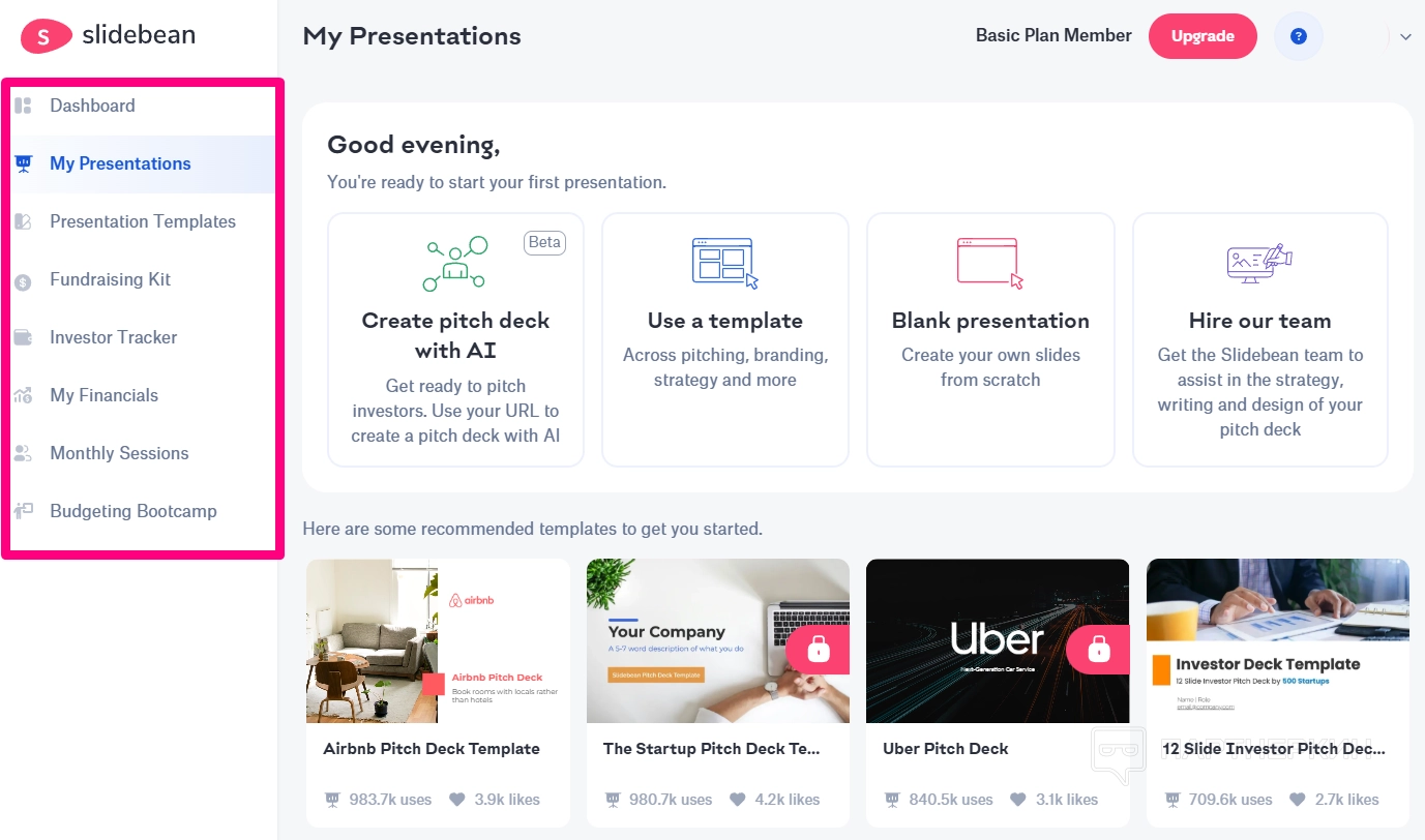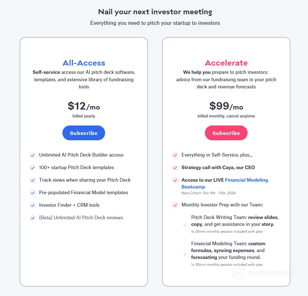 - All-Access. Это годовой план стоимостью 12 долларов в месяц. Он включает доступ к AI Pitch Deck Builder, 100+ шаблонов презентаций для стартапов, шаблоны финансовых моделей, а также инструменты для поиска инвесторов.