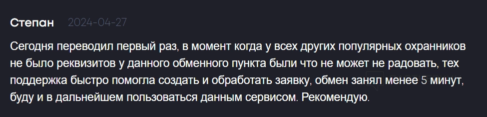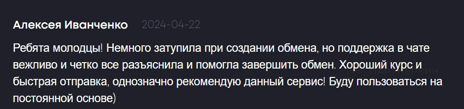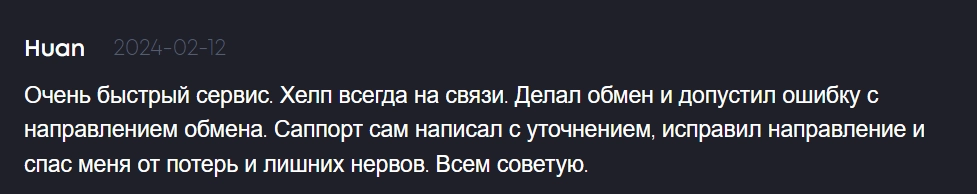 Ресурс имеет положительные отзывы на популярных мониторингах-обменниках. Пользователи высоко оценивают техническую поддержку сервиса. Специалисты помогают быстро создать и обработать заявки.