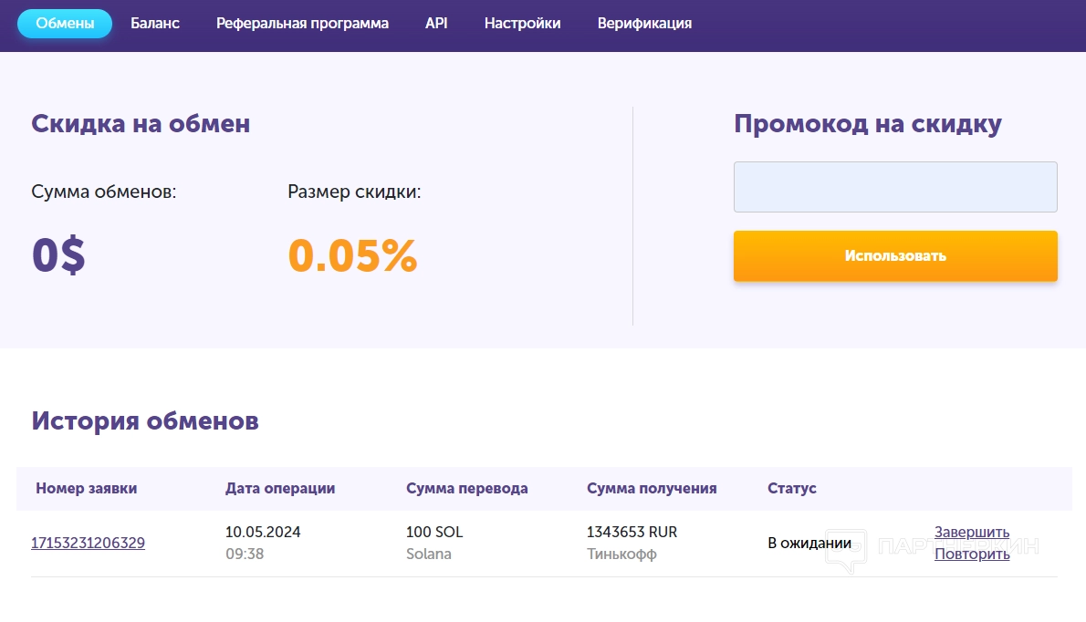 Обмены . Здесь отображается история обменов. Можно посмотреть номер заявки, дату операции, сумму перевода, статус, размер скидки, а также — ввести промокод на скидку (при наличии).