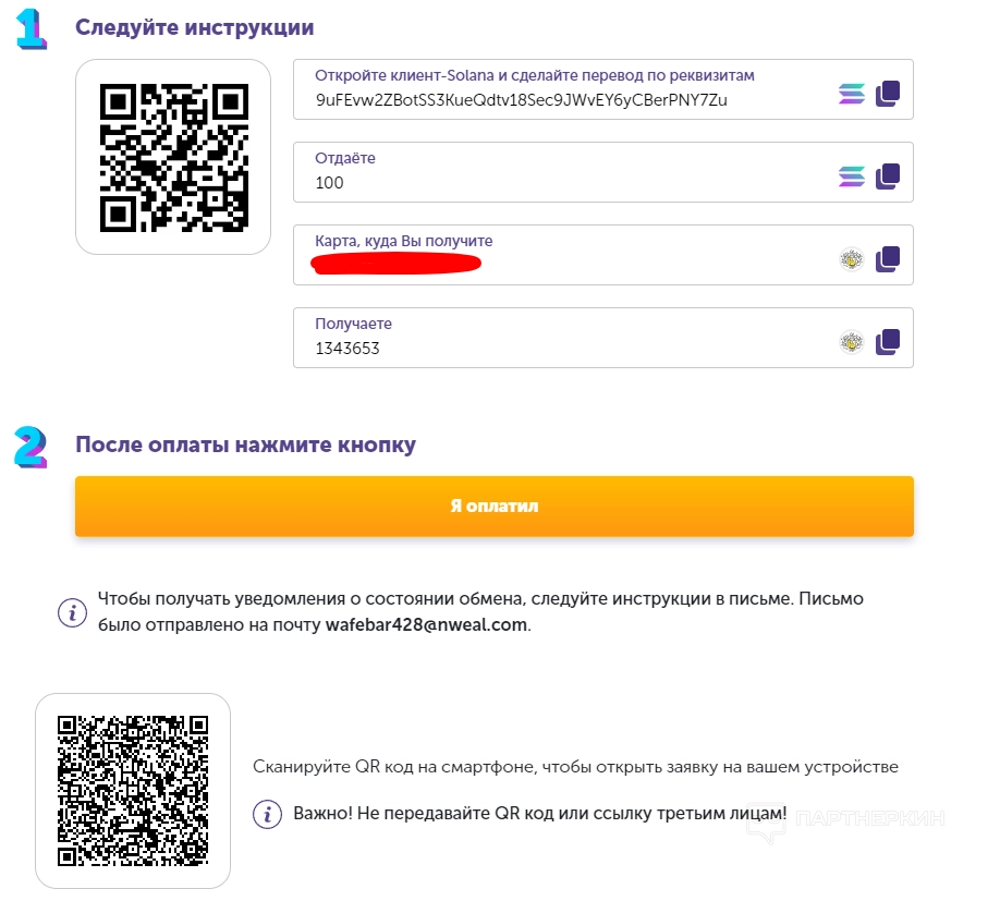 Обмен необходимо завершить в течение 15 минут после создания заявки. Следуйте инструкции: