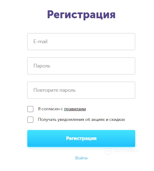 Создание учетной записи — необязательный пункт. Однако для участия в реферальной программе пользователю понадобится профиль. Чтобы создать аккаунт, необходимо нажать кнопку «Регистрация» в правом верхнем углу. Откроется форма, где нужно сделать следующее:
