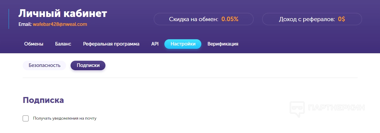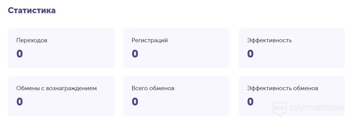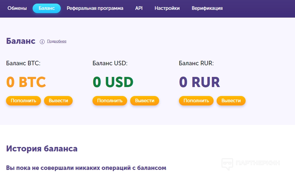 Реферальная программа . На этой странице отображается доход с рефералов (сумма и процент с обменов), реферальная ссылка и статистика (количество переходов, регистраций, эффективность, обмены с вознаграждением, всего обменов, их эффективность).