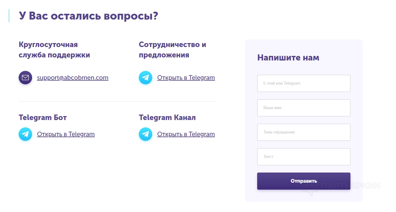 support@abcobmen.ru— круглосуточная служба поддержки;