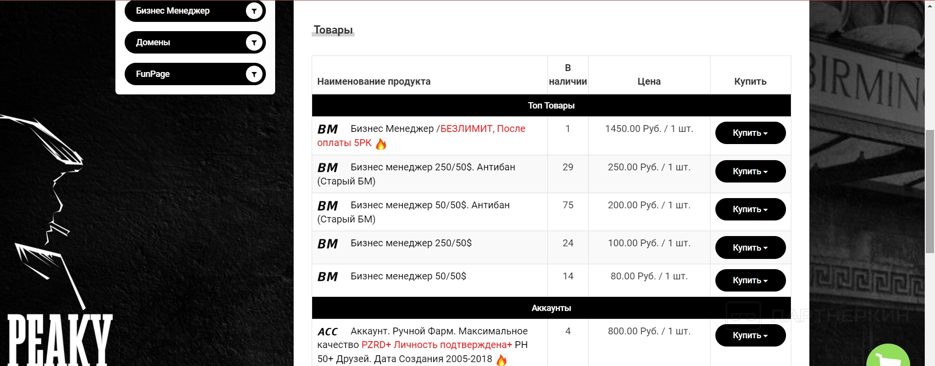 Peaky Shopпредлагает не так много разных видов аккаунтов. На данный момент на сервисе доступны аккаунты для Бизнес Менеджера, домены и FanPage. Есть отдельные предложения с аккаунтами с пройденным запретом рекламной деятельности и наличием верификации, но их не так много;
