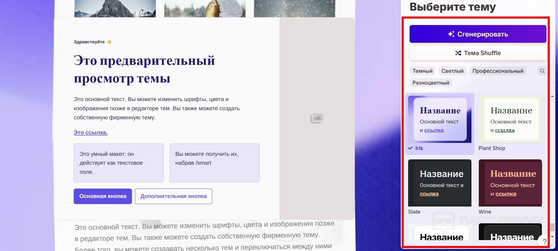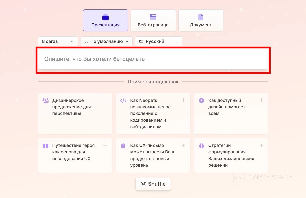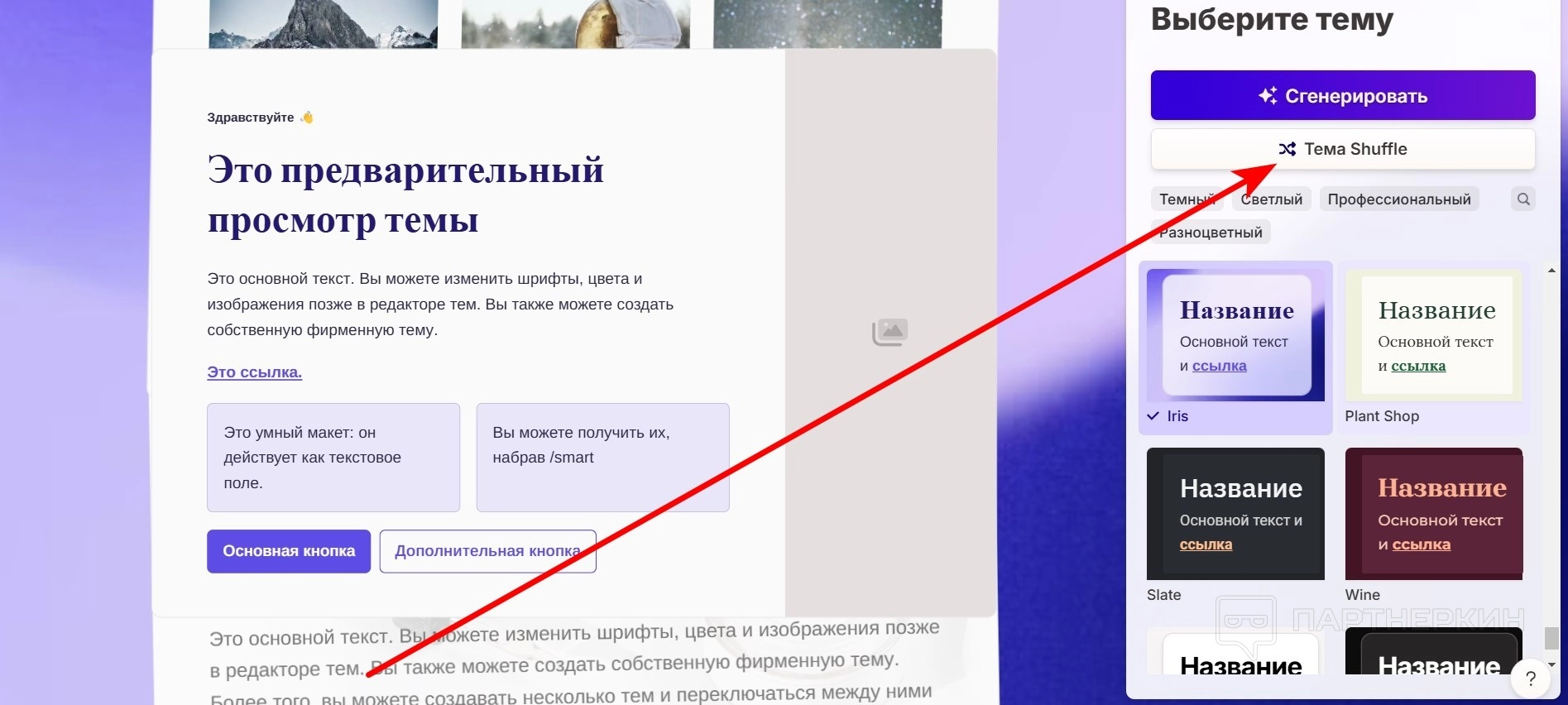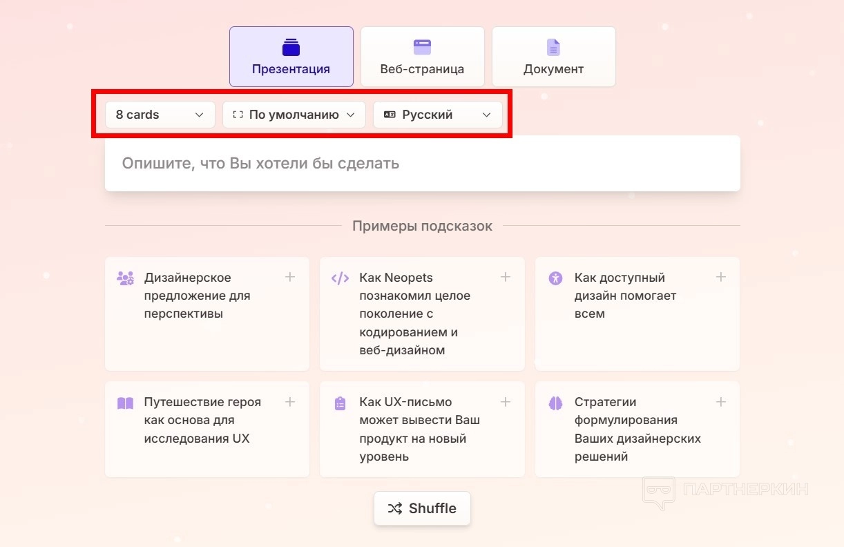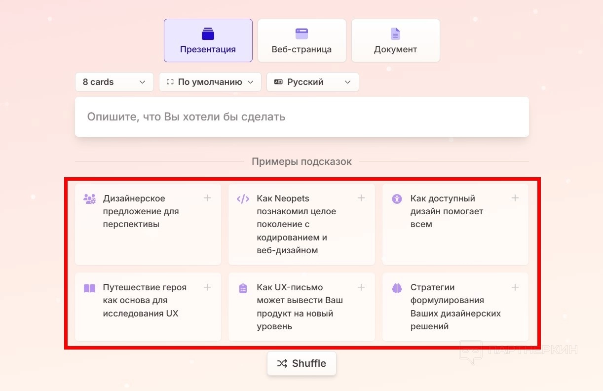 Внимание! Кнопка Shuffle дает возможность выбирать стиль и контент случайным образом.