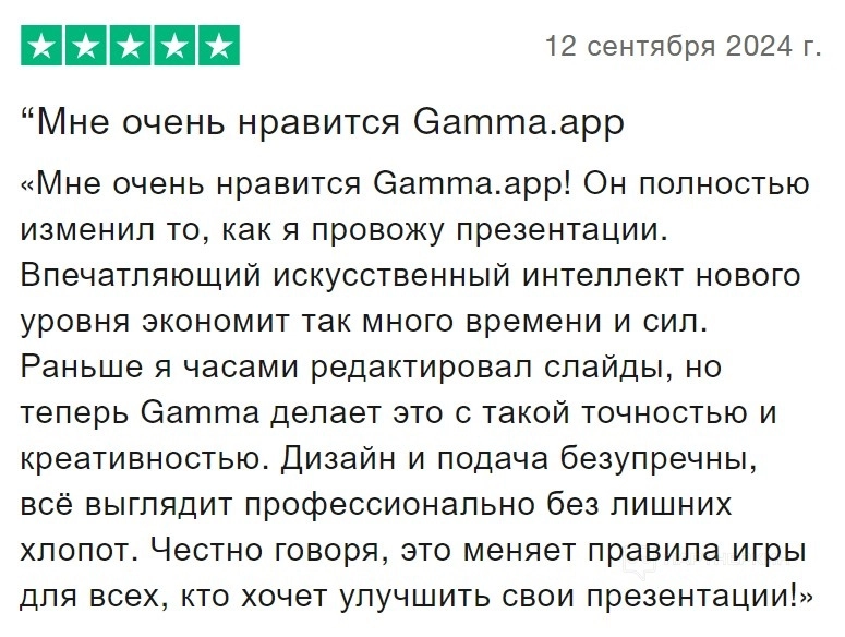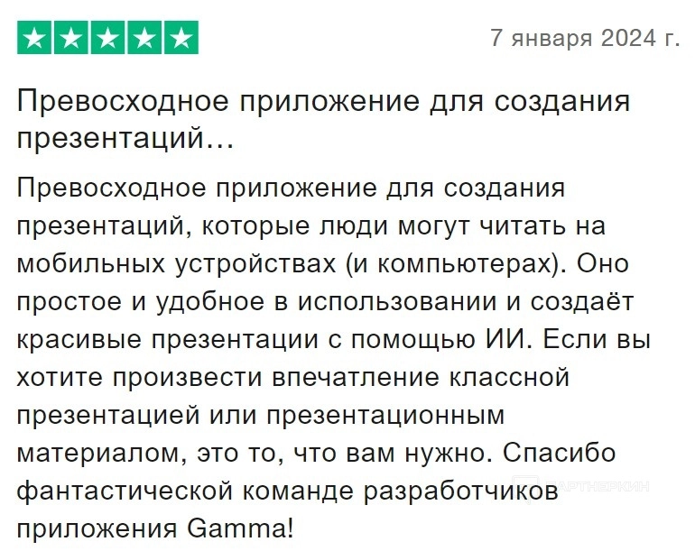 Пользователи отмечают, что инструмент генерирует профессиональный контент с помощью мощного искусственного интеллекта. Платформа помогает ускорить процесс создания и улучшить качество презентаций. Также пользователи отмечают, сто
