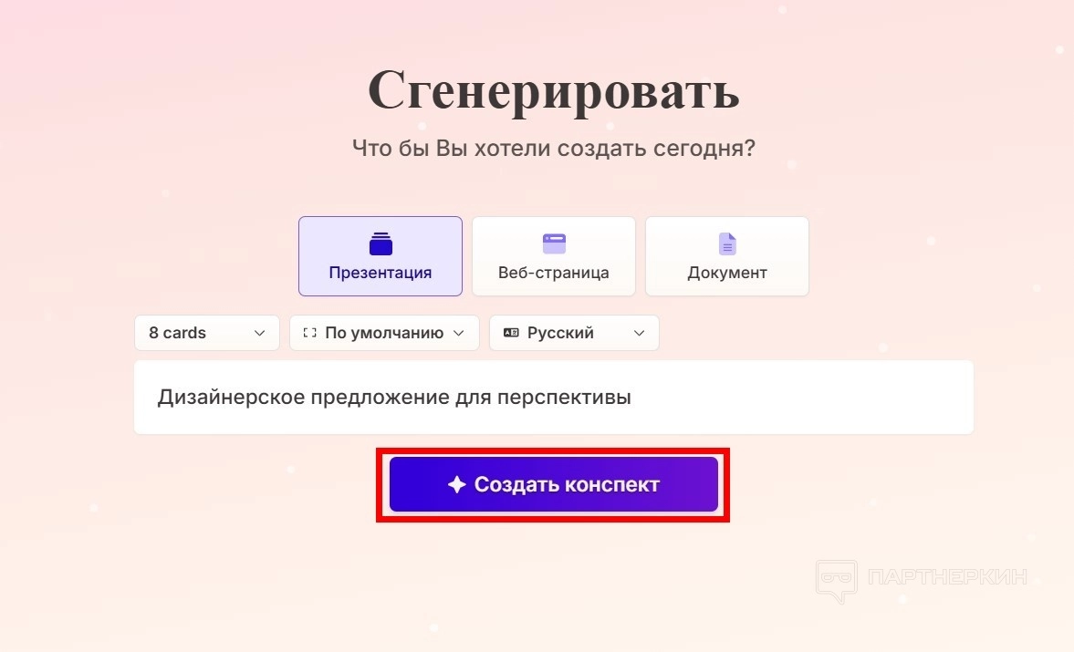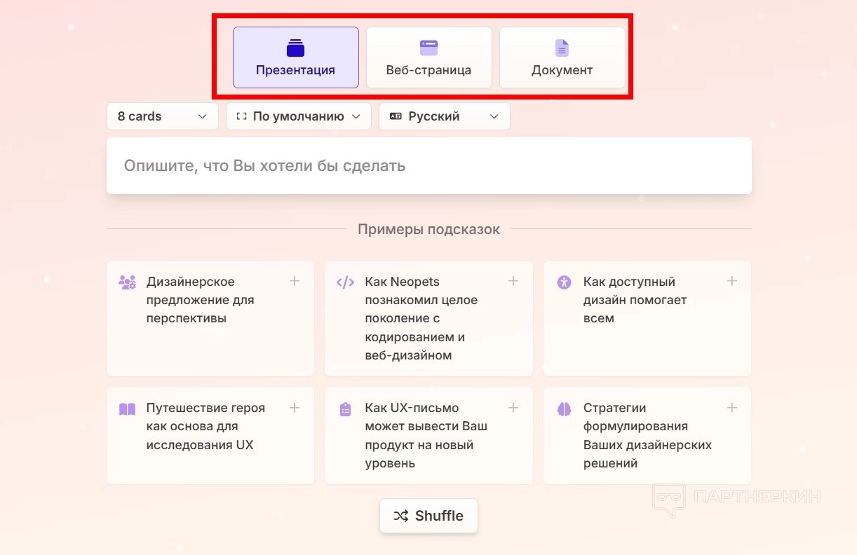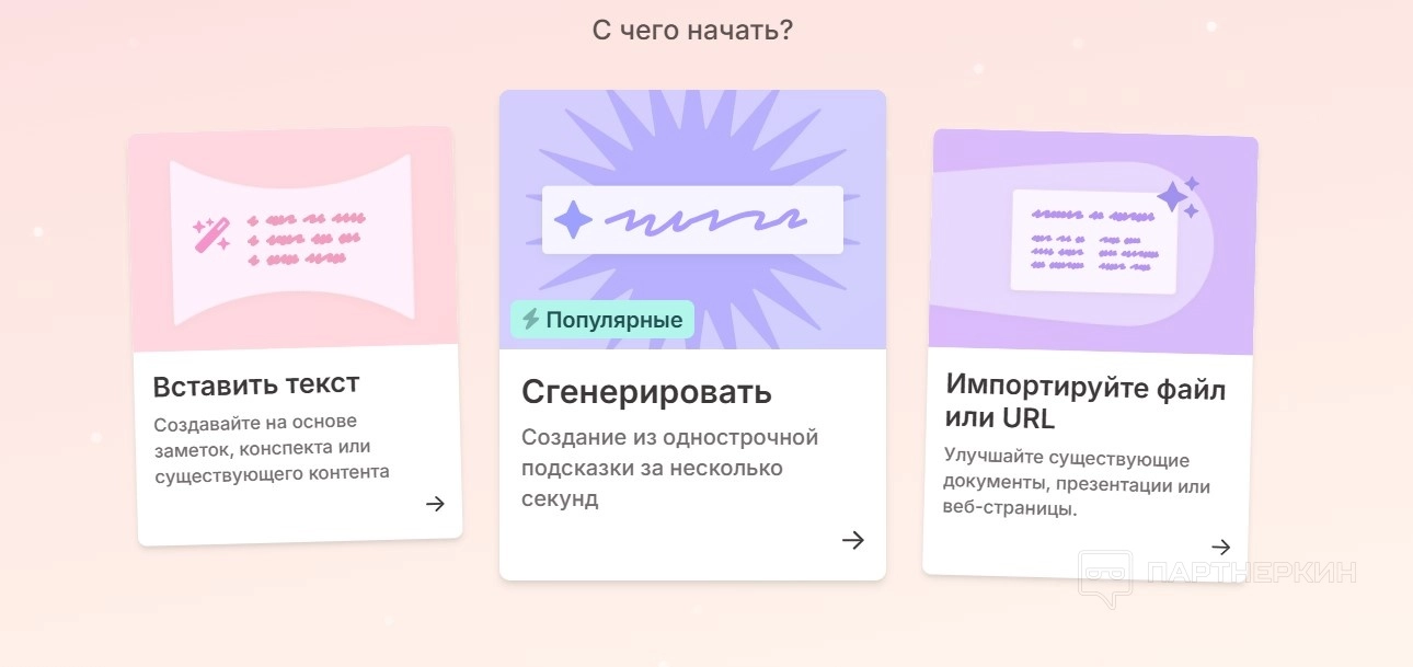 - Выберите, что хотите создать: презентацию, веб-страницу или документ. В данном случае мы выбираем презентацию.