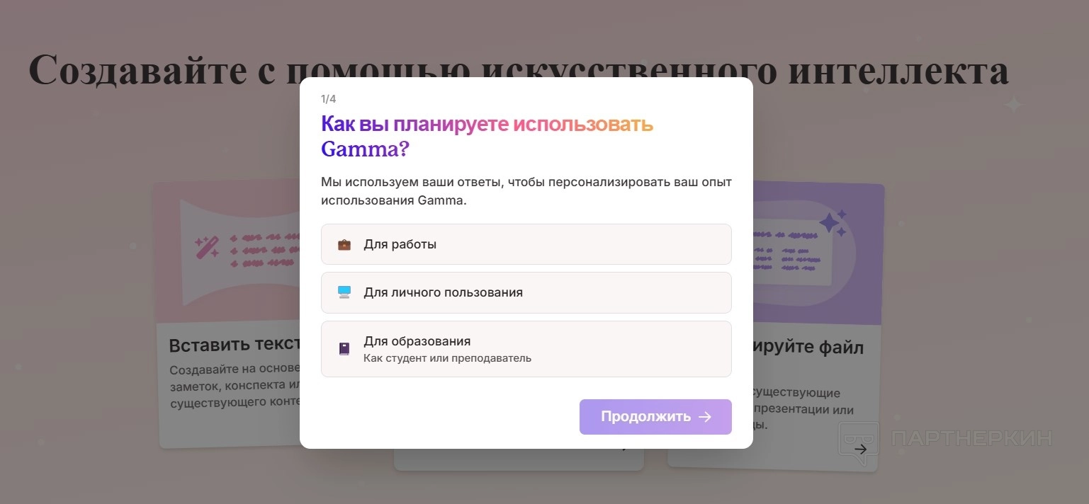 - На старте ИИ предложит ответить на несколько вопросов, чтобы подобрать релевантные запросы. Состоит из 4 шагов, которые включают для каких целей будет использован проект, место работы, тип контента и так далее.