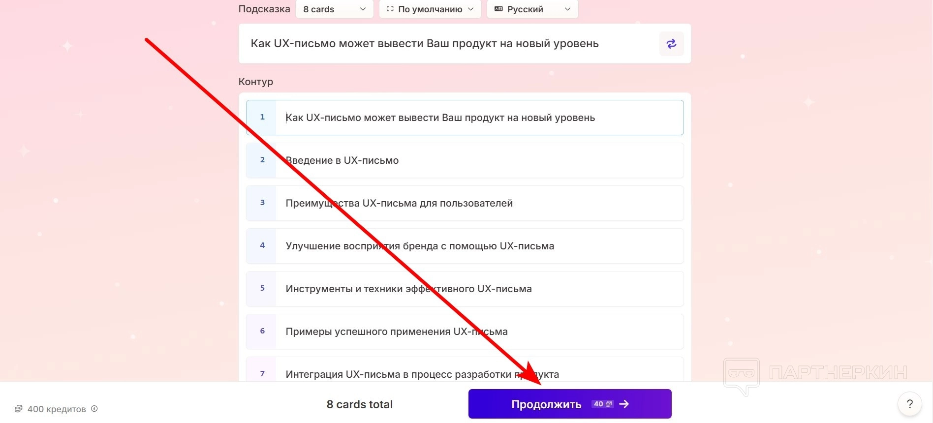 - ИИ сгенерирует черновой вариант плана. Его можно отредактировать. После чего нажмите на кнопку «Продолжить».