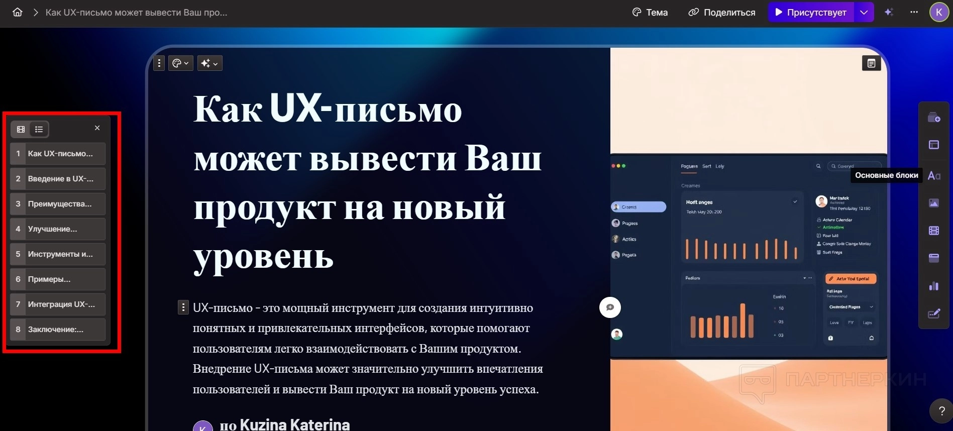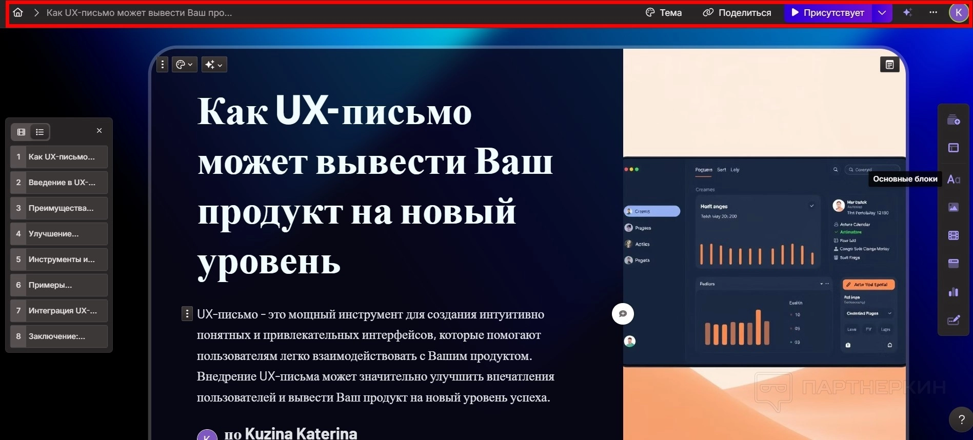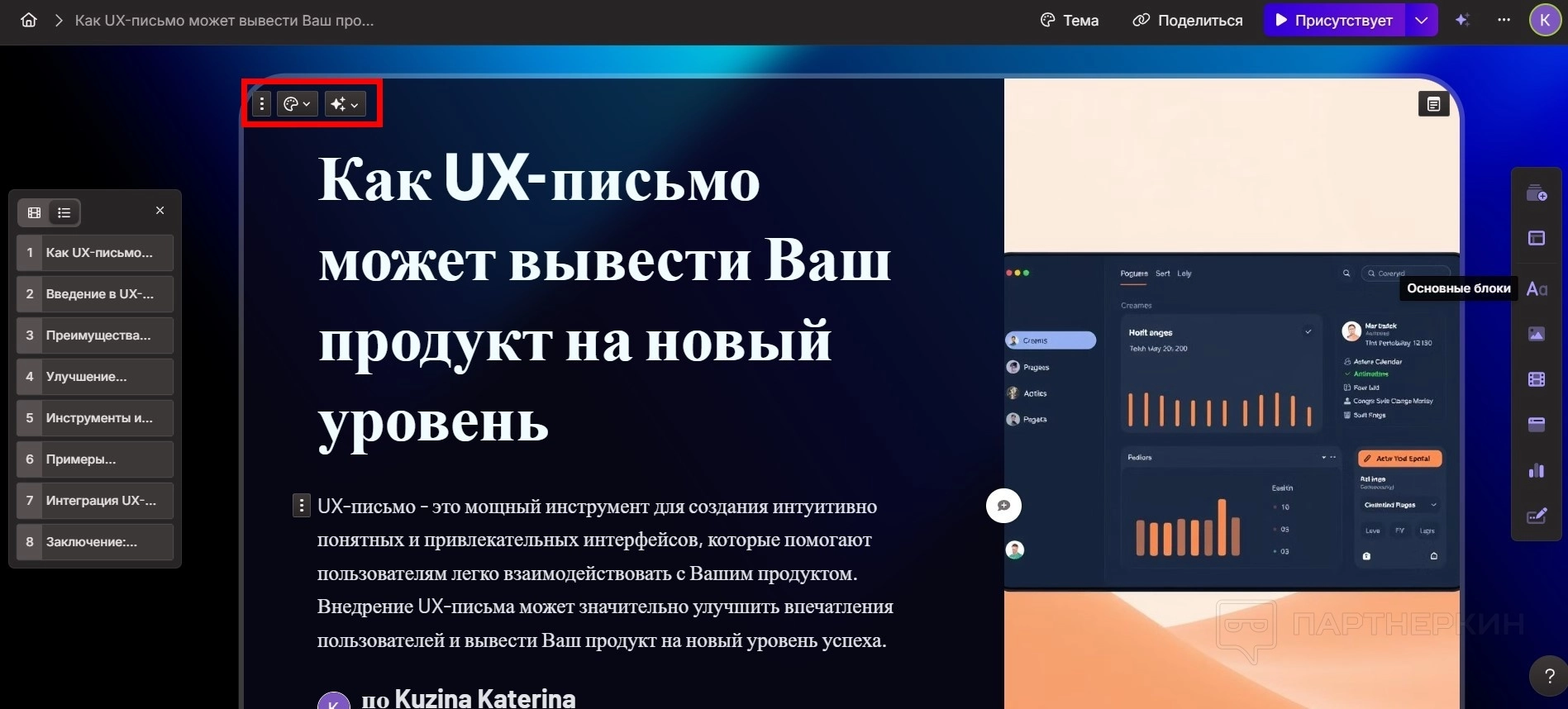 - Кнопки управления . Можно перемещать карточки, создавать их дубликаты. Также есть возможность менять стиль для одной страницы и улучшать качество контента. Например, исправить грамматические и орфографические ошибки.