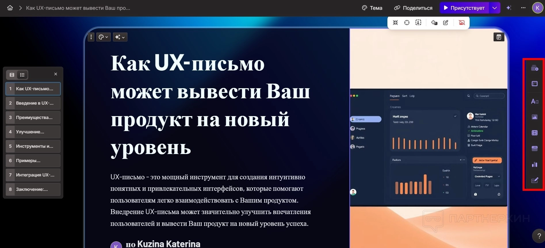 Это панель, где располагаются стандартные элементы управления. То есть ручное редактирование. Например, если пользователь хочет создать презентацию без использования ИИ. Также с помощью данных инструментов можно добавлять новые карточки, изображения и вставлять приложения и веб-страницы.