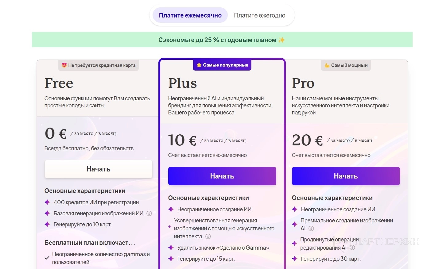Подходит для пользователей, которым нужны основные функции без обязательств. Этот план не требует ввода кредитной карты и остается бесплатным. Он предлагает доступ к базовому набору возможностей, включая 400 кредитов ИИ при регистрации, базовую генерацию изображений и возможность создавать до 10 карт. Пользователи получают неограниченное количество презентаций и пользователей, базовые возможности импорта и экспорта файлов в форматах PPT и PDF. Также возможность работать с конструктором сайтов.