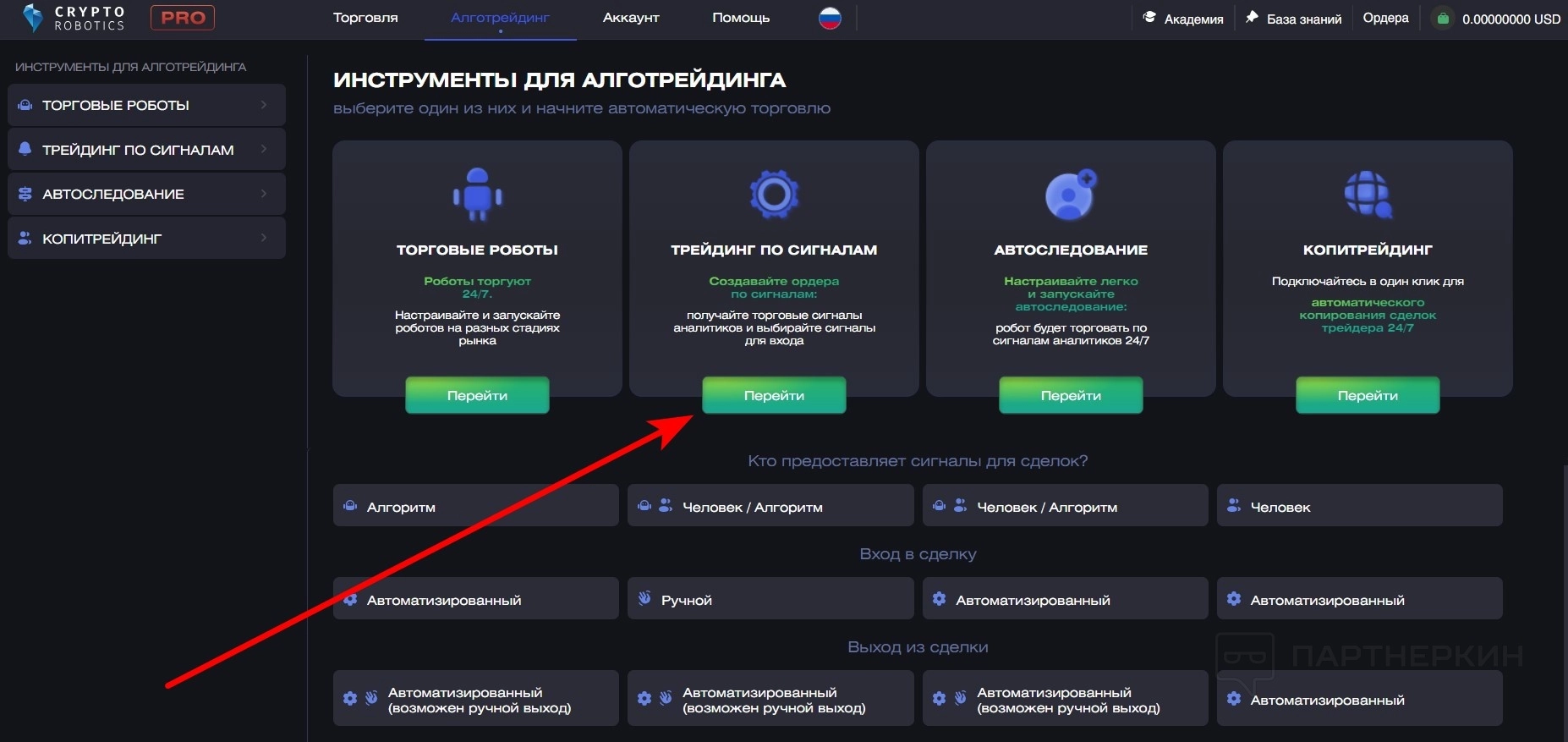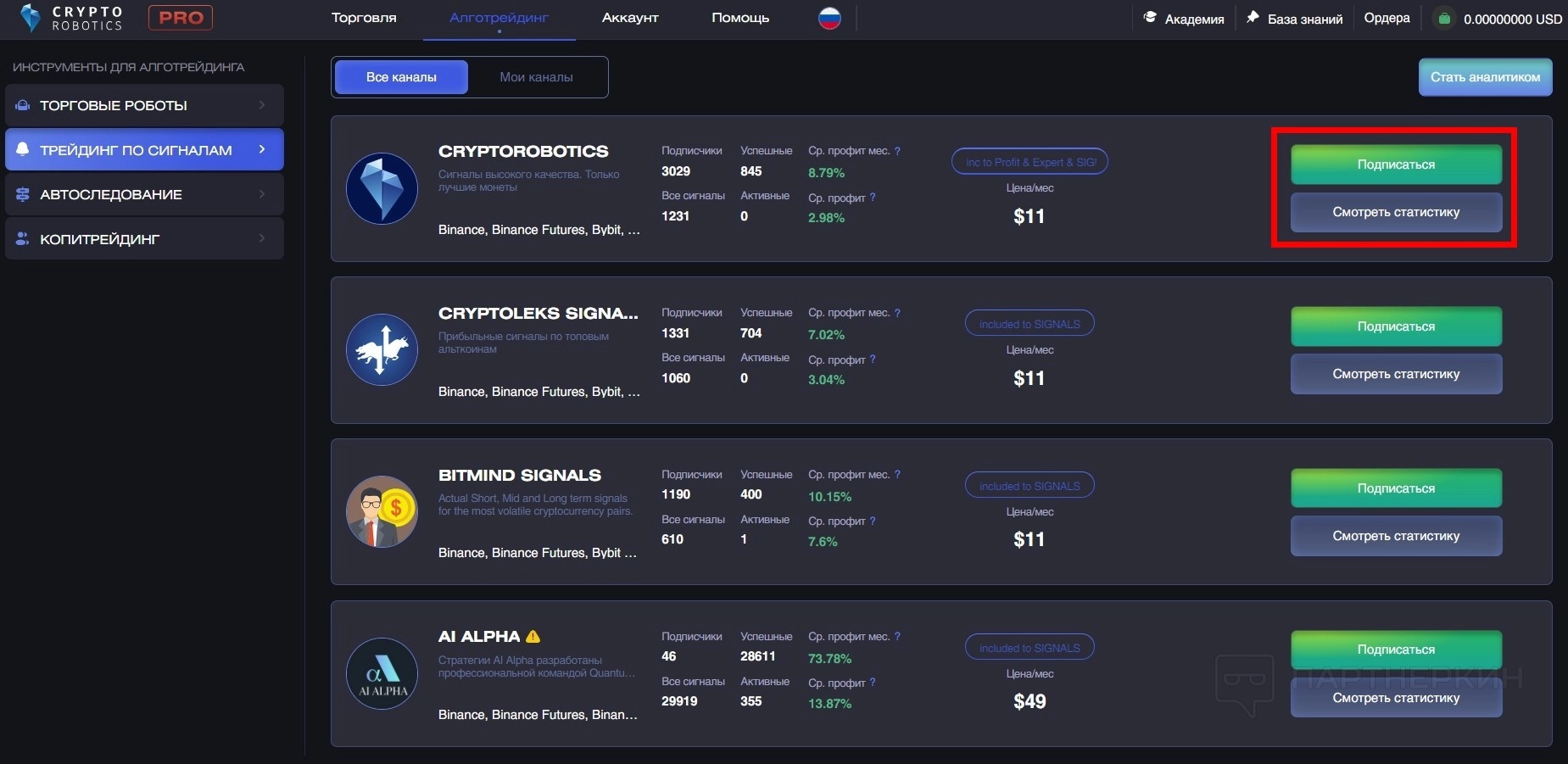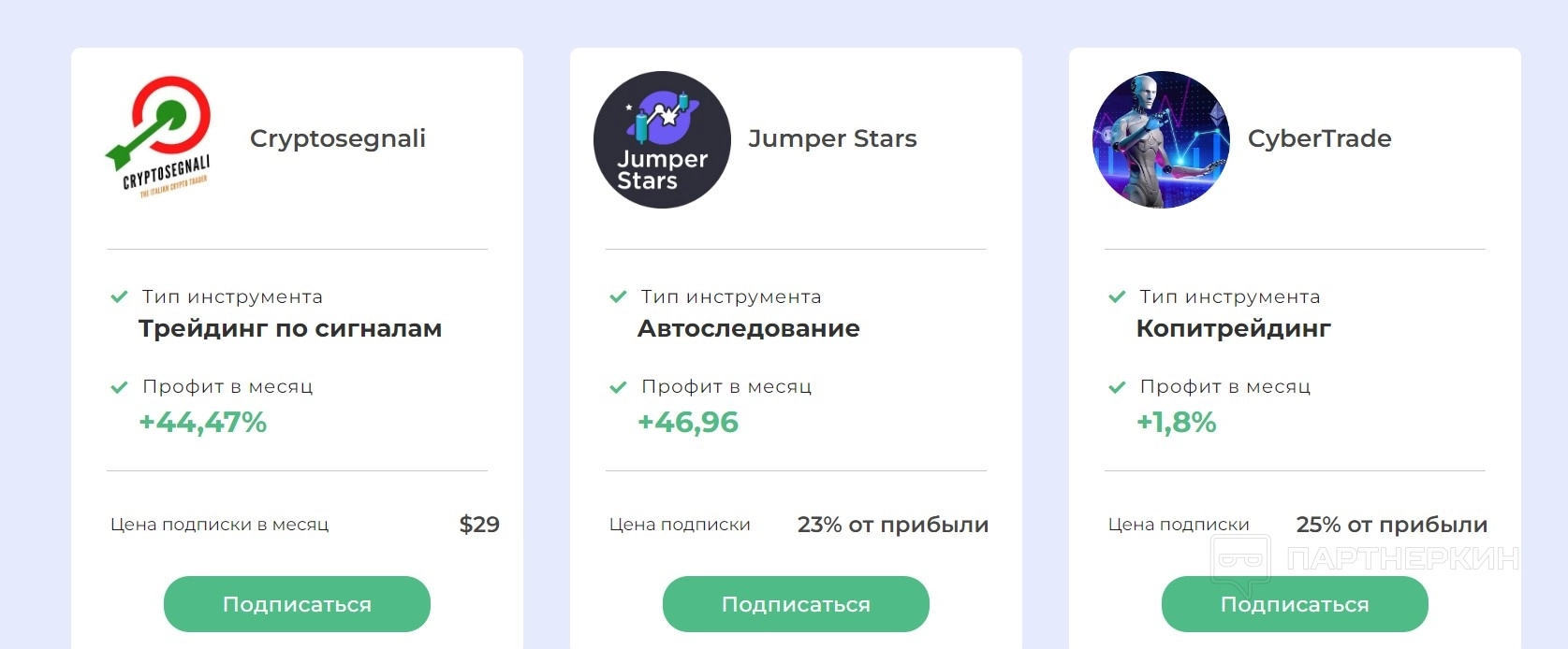 Платформа предлагает гибкие решения для разных категорий пользователей. Те, кто не уверен в своих силах или предпочитает не использовать ботов, могут воспользоваться торговлей по сигналам от профессиональных трейдеров.