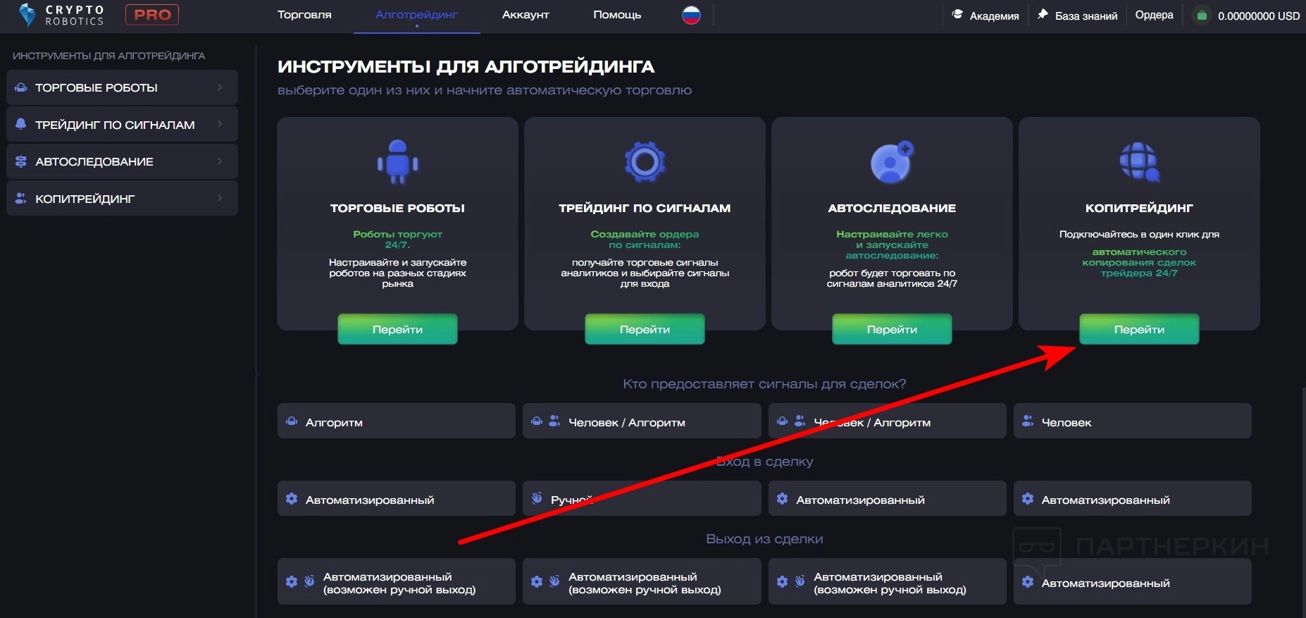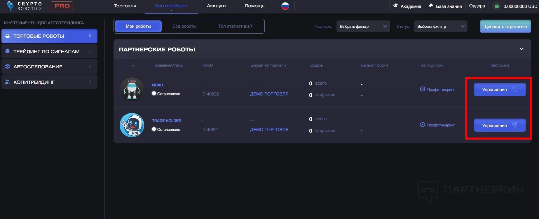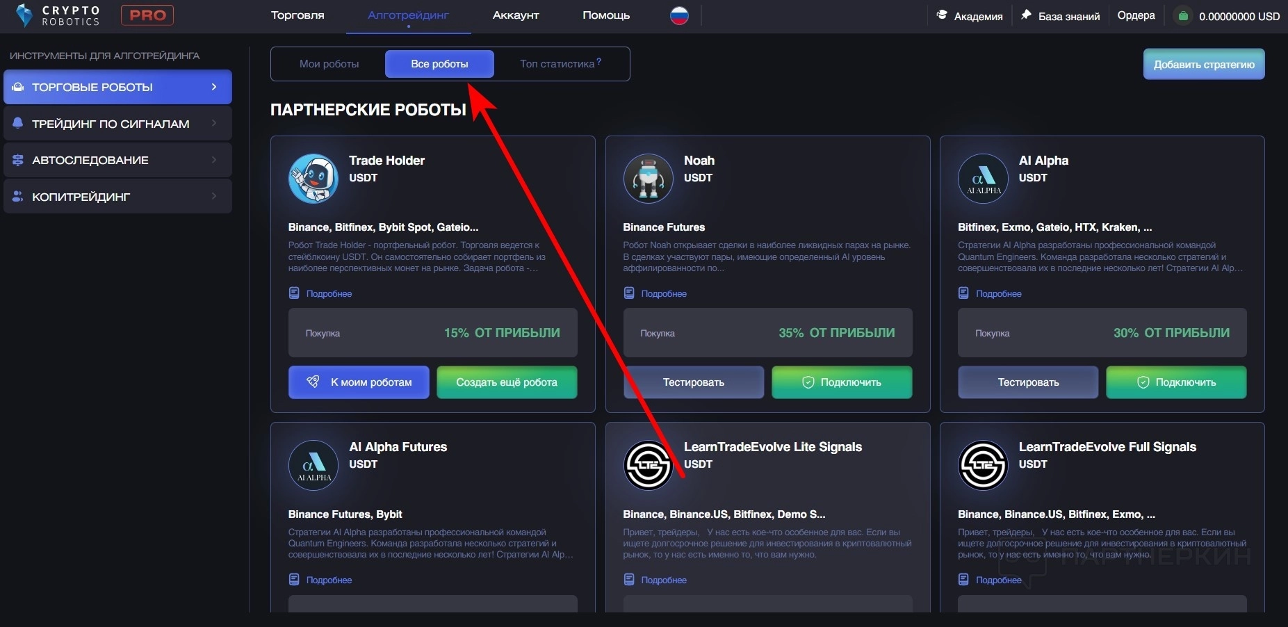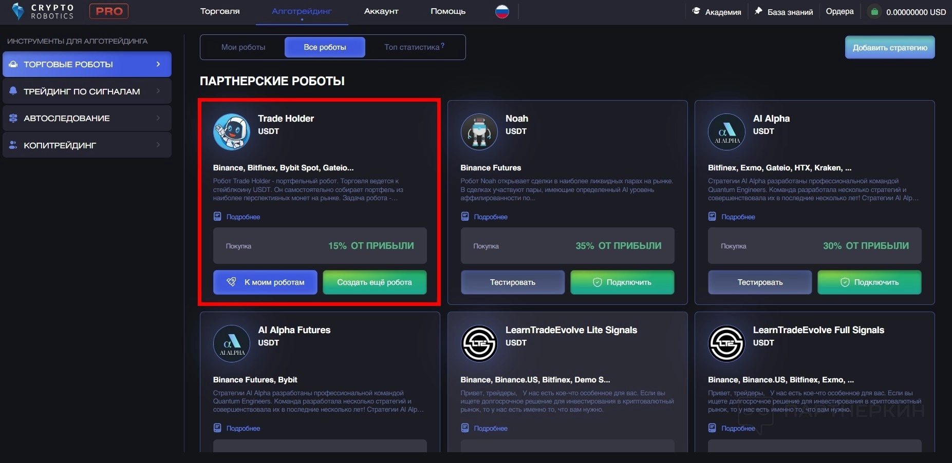Можно выбрать готового бота или настроить свою стратегию. Роботы от партнеров обладают своими настройками. С каждым ботом можно ознакомиться. Для добавления своей стратегии нужен пакет PRO. Выбор бота происходит во вкладке «Все роботы».